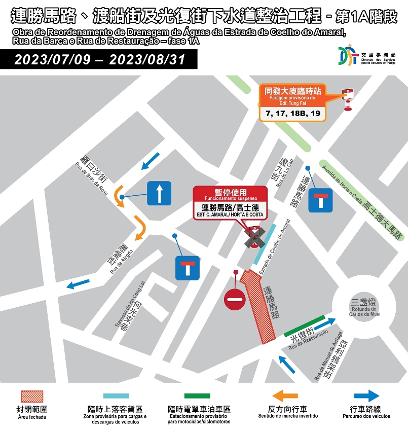 因应巿政署开展缓解新桥区水浸渠道优化计划,施工期间连胜马路、渡船街及光复街部份路段需分阶段封闭交通,预计会对区内交通造成一定压力及对市民出行造成不便,巿政署及交通事务局将因应施工情况公布各阶段的临时交通安排,呼吁巿民留意,及早规划出行路线。