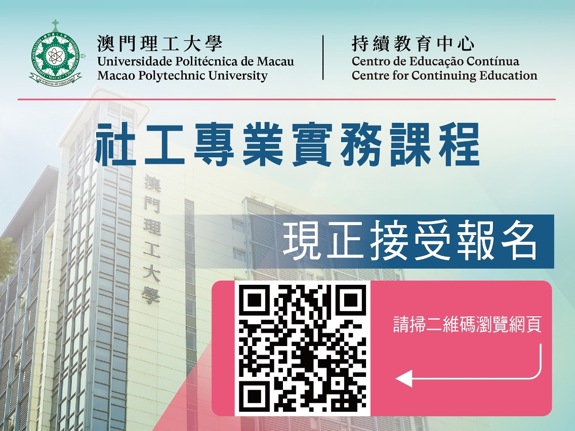为了回应社会工作者对专业进修的需求,澳门理工大学持续教育中心在2023年第三季度开办多项社工专业实务课程,包括“社会康复服务实务技巧”、“表达艺术治疗与社会工作应用” 、“培养青少年关键能力与实践”、 “亲密关系辅导—策略与技巧”、 “社区工作—居民会议实务” 、“社服项目策划与管理”、 “社工介入技巧应用”和“失智症患者照护”等,均获澳门社会工作者专业委员会认可为社会工作者持续进修活动,现正接受报名。