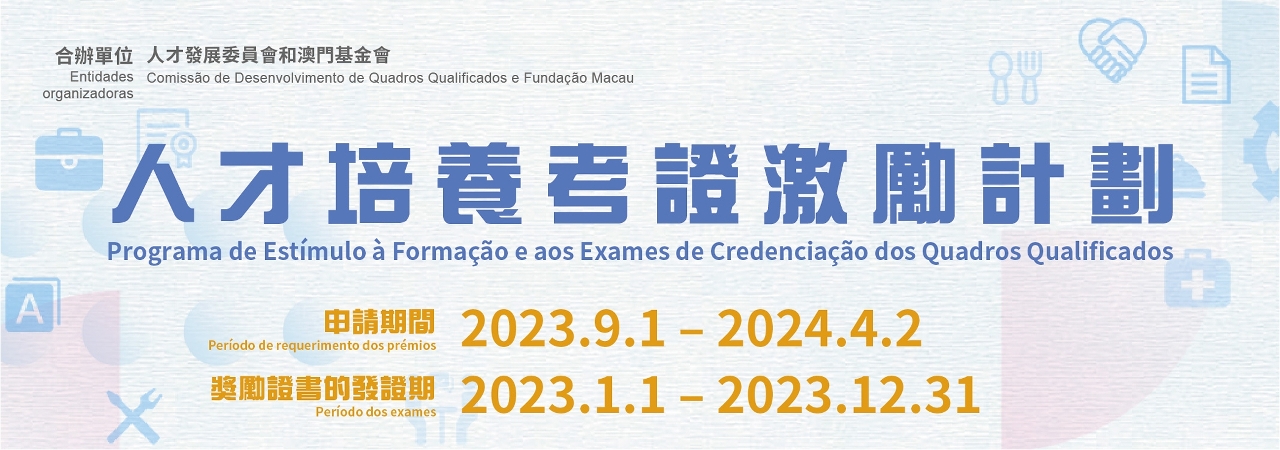 由人才发展委员会及澳门基金会合办的“人才培养考证激励计划”(下称“计划”)将于本年度继续推行,申请期为2023年9月1日至2024年4月2日,奖励合资格申请人于2023年1月1日至12月31日期间获发的证照。奖励目录包括:外语能力测试、行业导向认证考试、“现代金融人才专业认证”及“资讯技术人才专业认证”,申请获批后将可获得相应奖励。
