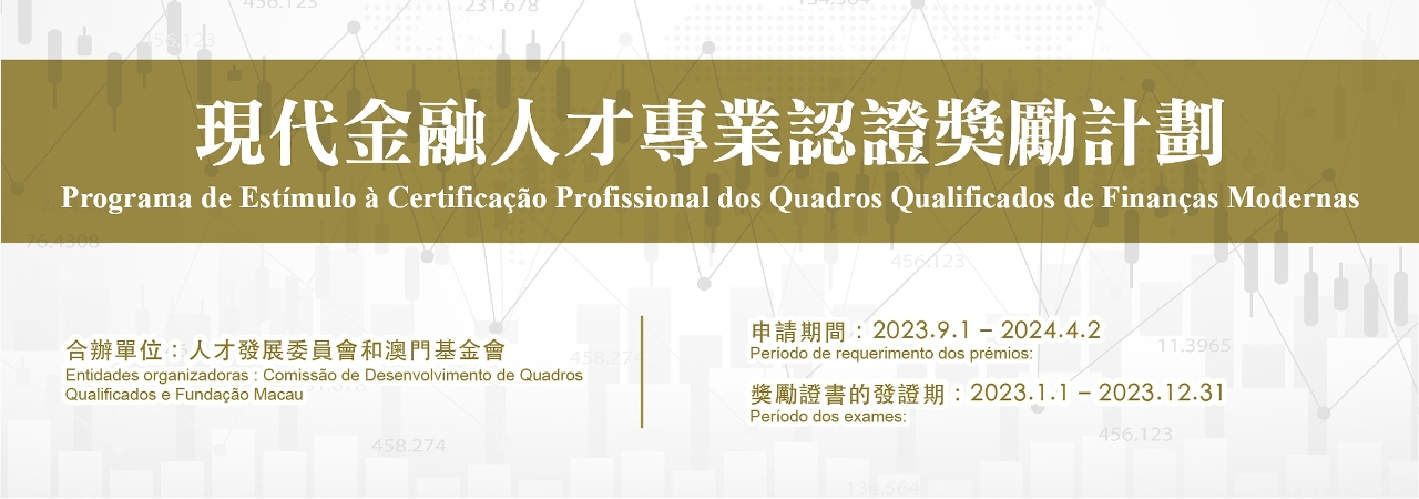 “现代金融人才专业认证奖励计划”的申请条件为:于2023年1月1日至12月31日期间,取得奖励目录内证照的澳门居民,可于网上申请,奖励分1,000、3,000、6,000及8,000澳门元四个组别,分别有60、100、100和80个名额,合共340个。计划旨在推动澳门居民考取与证券、资产管理、财富管理、风险管理及金融分析相关专业认证,藉此为业界储备各类具专业认证资格的金融人才。