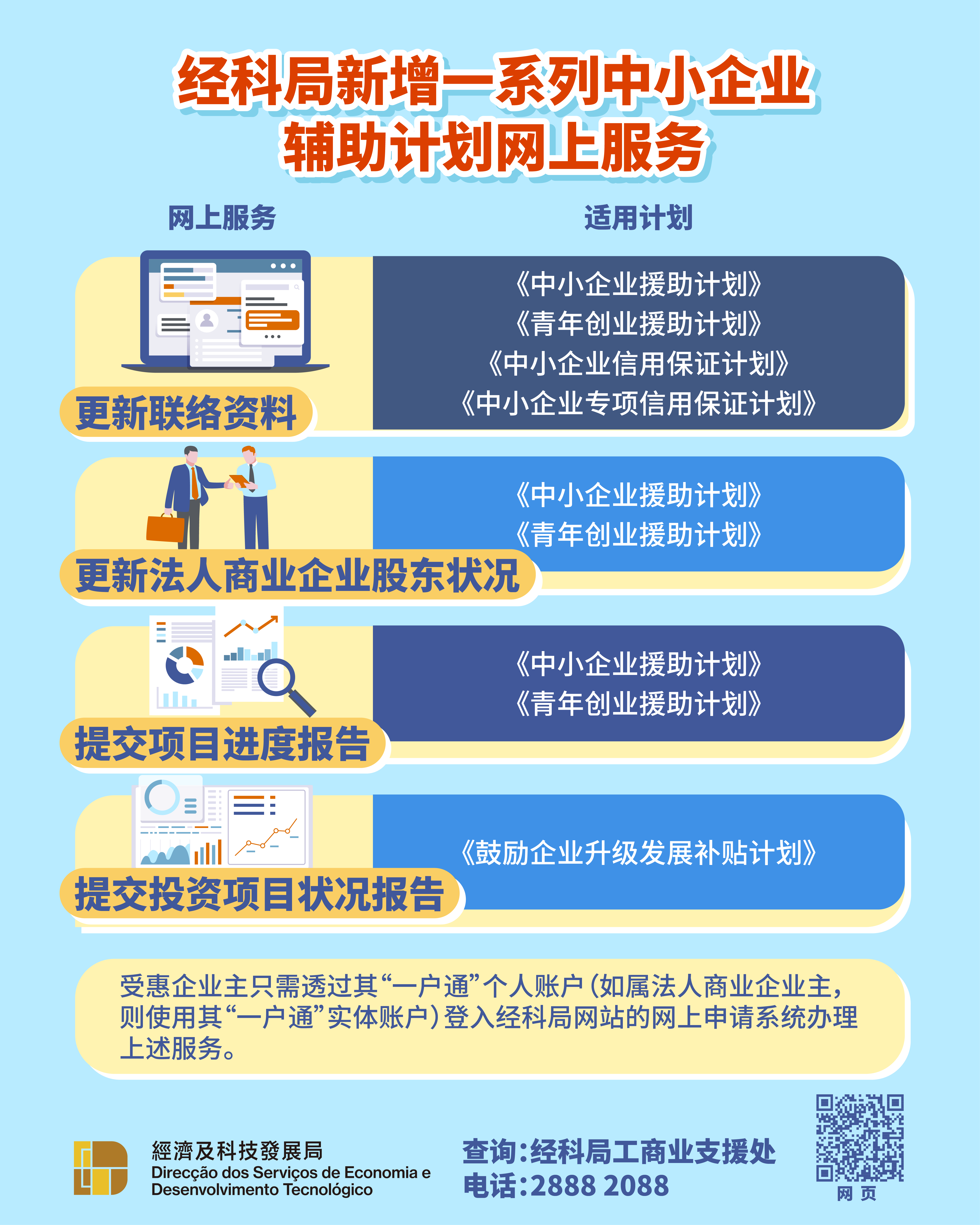 为持续优化电子政务,提供更多便民便商的服务,经济及科技发展局自本月起就《中小企业援助计划》、《青年创业援助计划》、《中小企业信用保证计划》、《中小企业专项信用保证计划》等各项中小企业辅助计划,新增了 “更新联络资料申请”、 “更新法人商业企业股东状况申请”、“提交项目进度报告” 等多项网上服务以及就《鼓励企业升级发展补贴计划》新增了“提交投资项目状况报告”的网上服务。