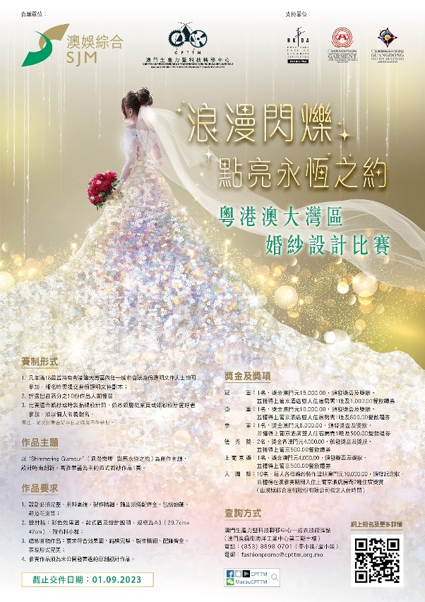 为加强推动大湾区时尚产业联动及发展,澳门生产力暨科技转移中心与澳娱综合度假股份有限公司合办粤港澳大湾区婚纱设计比赛,比赛现接受报名,截止日期为9月1日,欢迎对缗纱设计有兴趣人士参加。