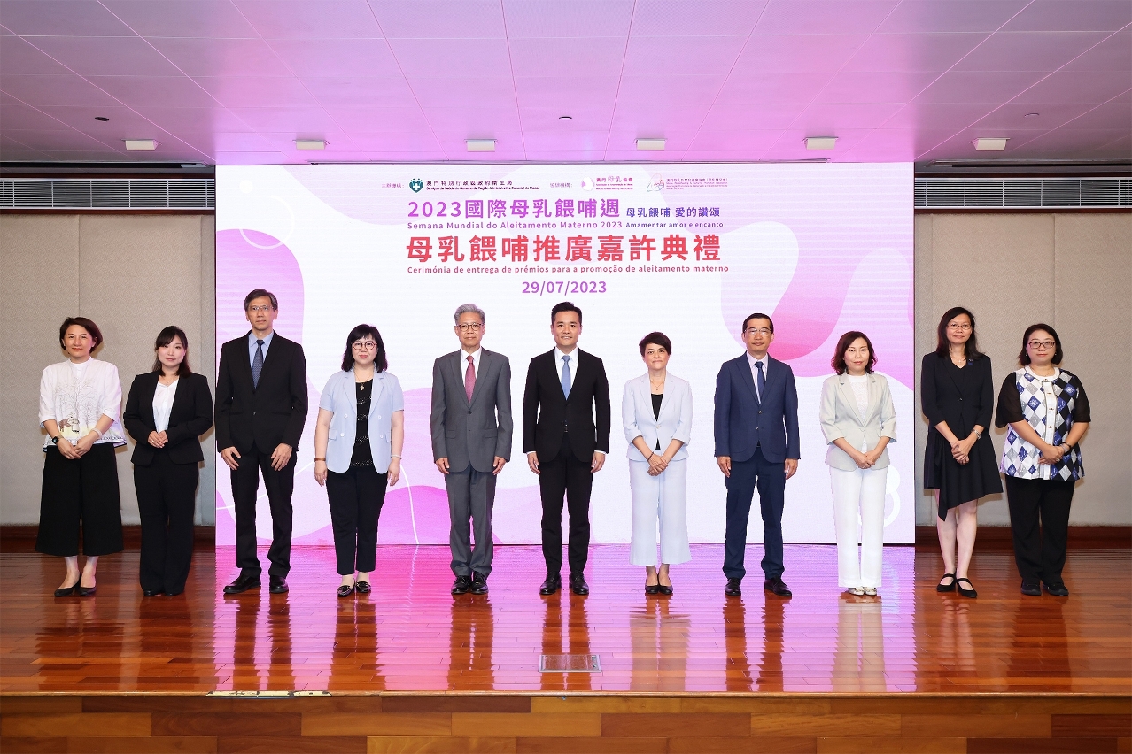 为响应2023年国际母乳喂哺周,由卫生局主办,澳门母乳协会、澳门母乳及育儿推广协会协办的‶2023母乳喂哺推广嘉许典礼″于日前举行,卫生局罗奕龙局长、郭昌宇副局长、郑成业副局长、梁基雄代副局长及多个公私营机构、学校代表等出席典礼,还有44个家庭,约200多人参加是次活动。今年获得颁发嘉许状的公、私营机构共196间,获颁发嘉许状的学校共6间;另分别有245位母乳喂哺的妈妈获得嘉许。