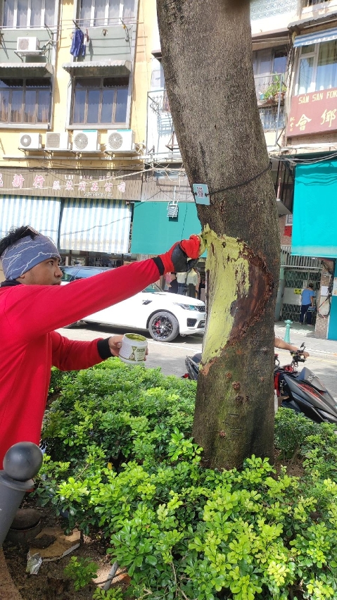 养护人员对树木采取药物救治