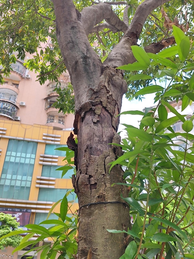 蒲桃树皮萎缩及坏死的范围扩大,树干外露的木质部有干裂纹。