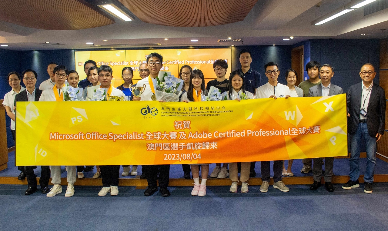 澳门生产力暨科技转移中心率8名澳门学生代表前往美国,参加Microsoft Office及Adobe软件技能全球大赛,勇夺四项全球冠、亚军。该中心感到鼓舞,将继续发掘有潜质的青少年,为本澳培养更多人才。
