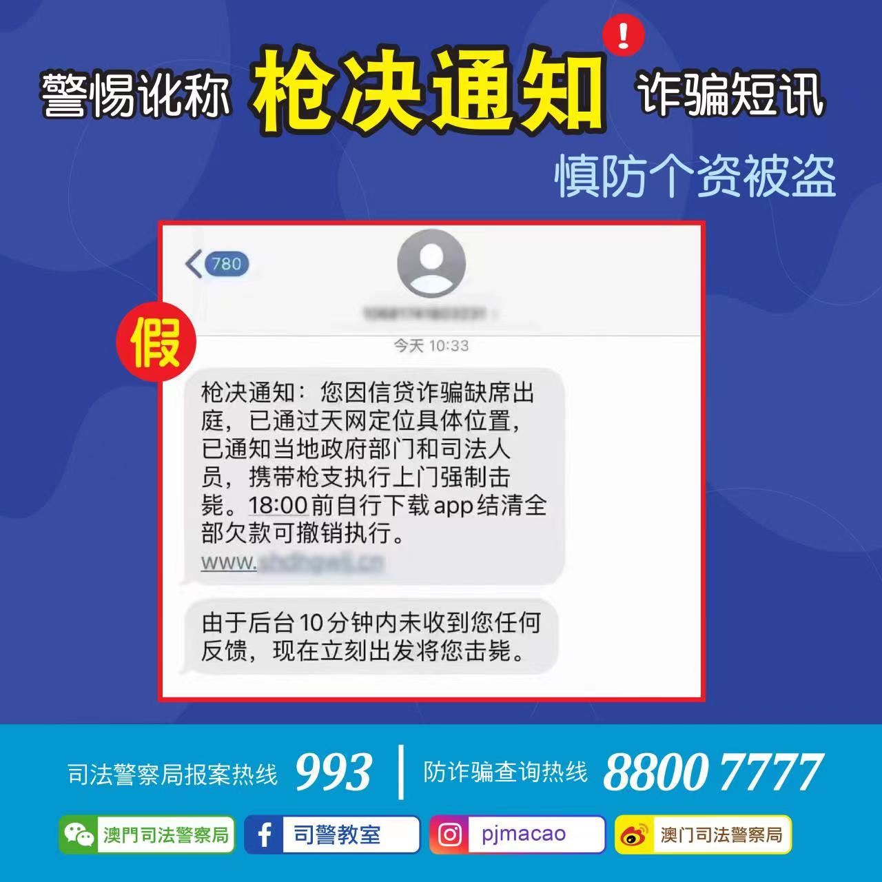 • 司警局呼吁市民警惕讹称枪决通知诈骗短讯慎防个资被盗用
