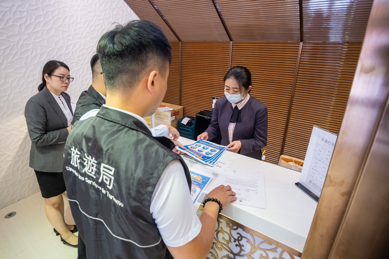 旅游局各旅客询问处已于显眼位置展示台风信息及"台风季节游澳谨慎出行"告示,提醒有关公共交通服务暂停等讯息,询问处人员会主动提醒旅客注意台风期间的交通及避险安排等。