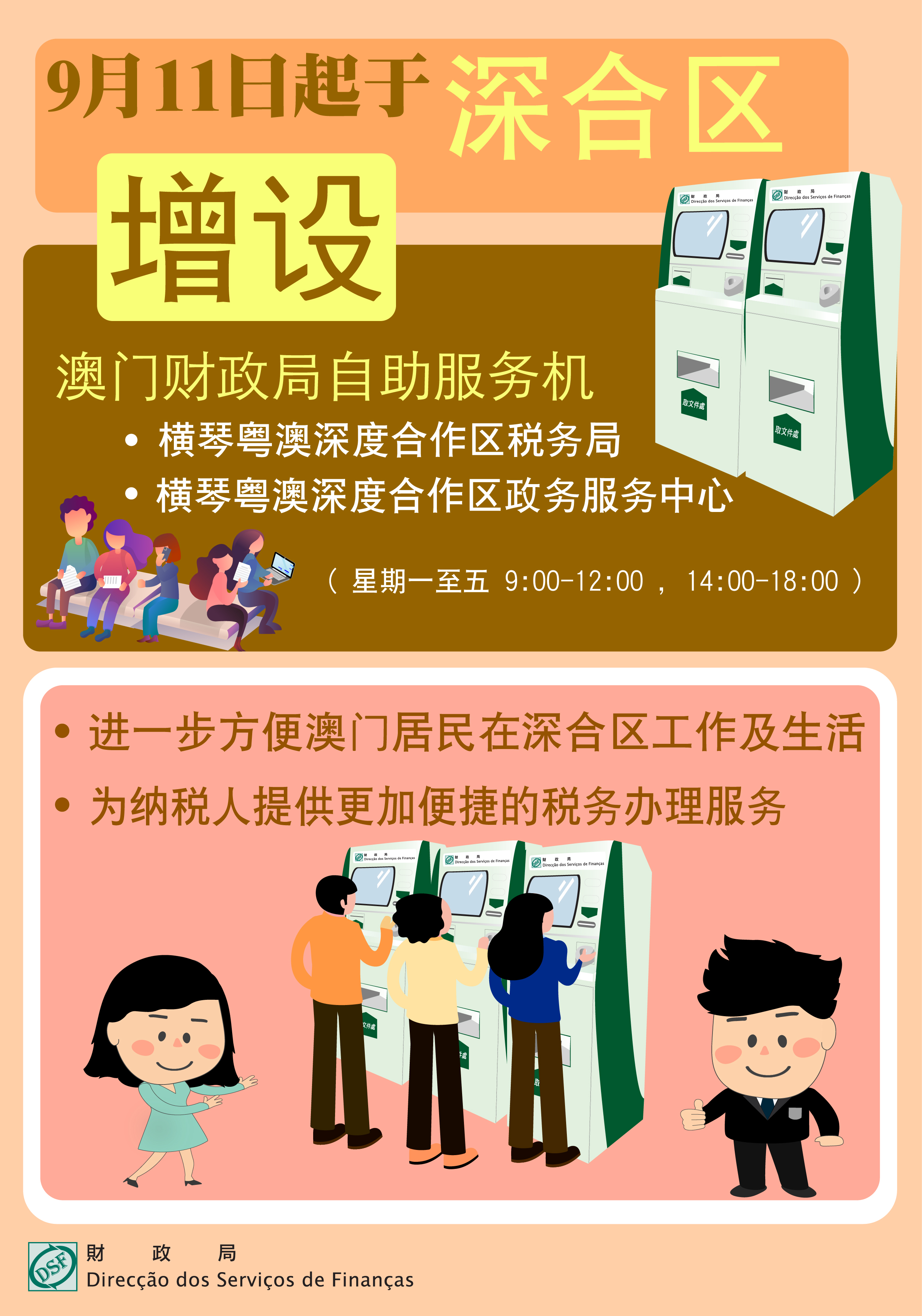 为进一步方便澳门居民在横琴粤澳深度合作区工作及生活,及为纳税人提供更加便捷的税务办理服务,配合横琴粤澳深度合作区政务的发展,澳门财政局于9月11日起于横琴粤澳深度合作区税务局及政务服务中心分别设置了自助服务机。