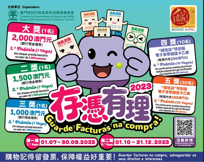 “存凭有理2023”分两期进行(第一期由2023年7月1日至9月30日;第二期由10月1日至12月31日),每期设43份奖品,头奖、二奖及三奖各1名,分别获2,000澳门元、1,500澳门元及1,000澳门元的银行现金礼券,四奖10名及五奖30名,分别各得内附200澳门元及100澳门元的“诚信店”特别版电子货币储值卡乙张。
