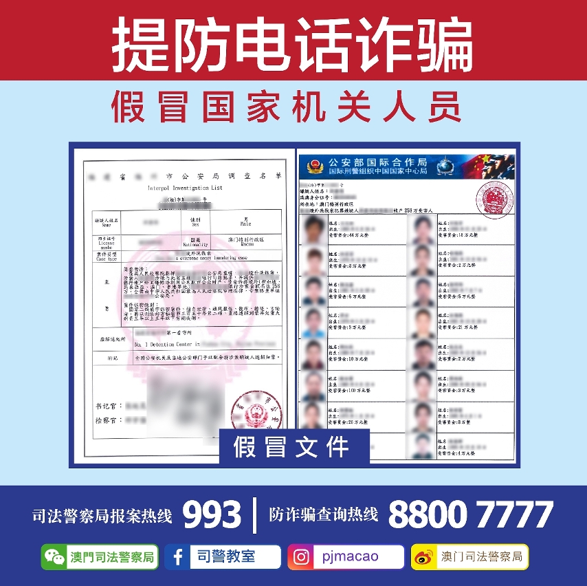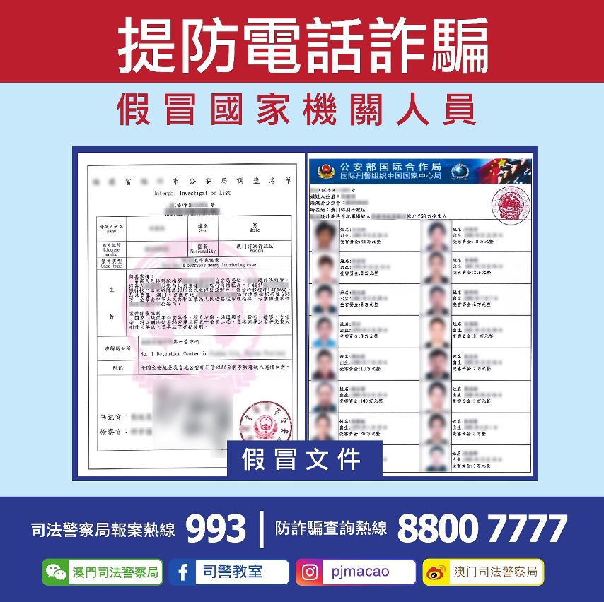 近日司法警察局再接获多名市民举报,称收到假冒国家机关人员之诈骗电话,骗徒假冒为国家机关人员以“+852”字头的号码致电事主,直接说出事主的姓名及身份资料,并讹称事主曾寄送涉及犯罪的包裹往内地、在内地开设手机号码发送大量诈骗短讯,或讹称事主牵涉内地重大刑事案件等等,要求事主配合“内地公安机关”调查。