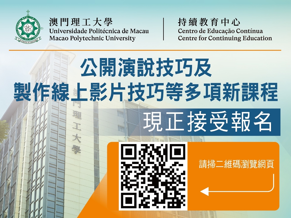 为积极回应社会发展所需,推动居民持续装备自我,提高竞争力,把握社会发展机遇,澳门理工大学持续教育中心将陆续开办多项新课程,包括 “公开演说技巧” 和 “制作线上影片的技巧与应用”。