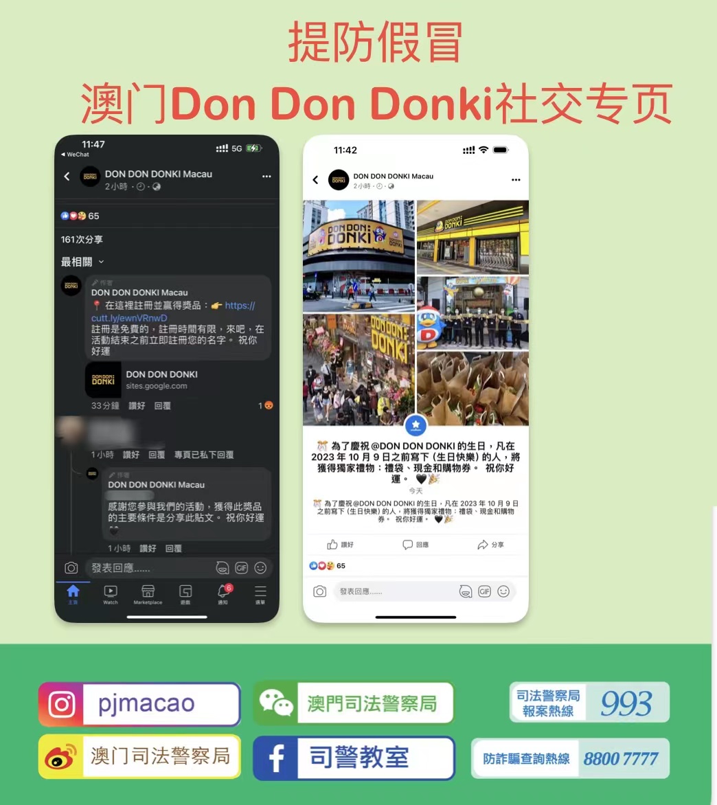 司警局反诈骗协调中心发现今日有骗徒在网上社交平台开设假冒澳门Don Don Donki的Facebook专页。