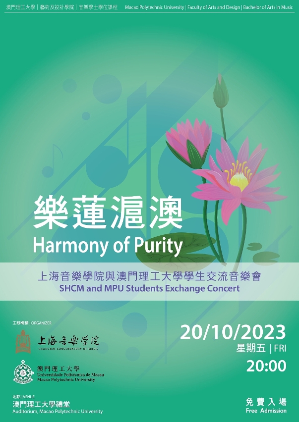 澳门理工大学与上海音乐学院将于2023年10月20日晚上8时于澳门理工大学礼堂举办“乐莲沪澳——上海音乐学院与澳门理工大学学生交流音乐会”,为观众带来一场中西音乐的飨宴。