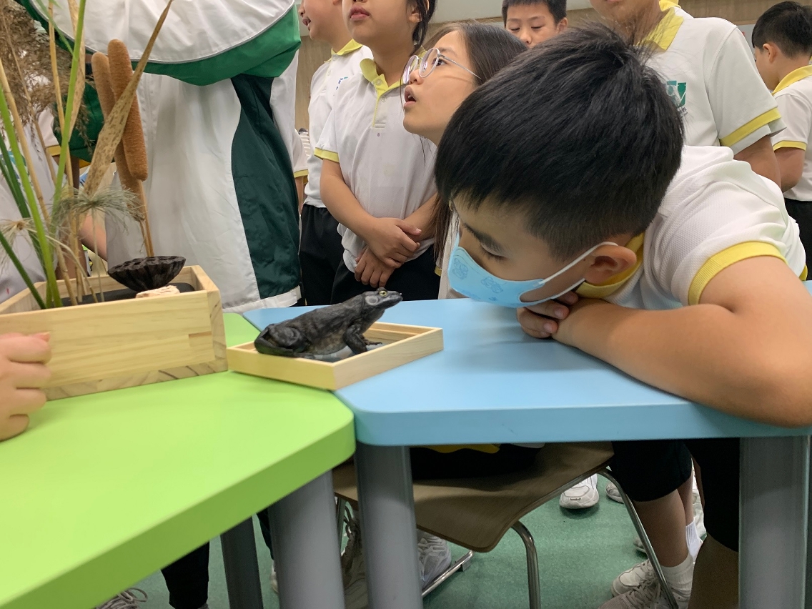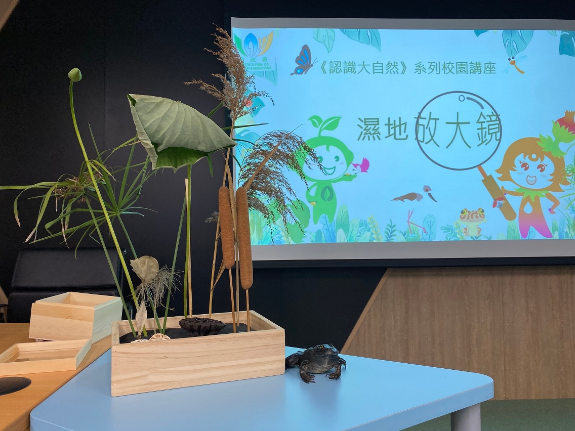 《湿地放大镜》的对象是小学高年级学生,主要介绍「地球之肾」—湿地的生态系统及澳门的湿地概况,让学生认识到湿地除了是重要的自然环境外,当中更蕴藏着丰富的生物多样性资源,是一本天然的教科书。讲座展示湿地常见的植物和动物标本及模型,让学生触摸这些展品,透过贴近感官的趣味学习,协助学生从小建立对环境的关注,培养同理心和保护大自然的态度。