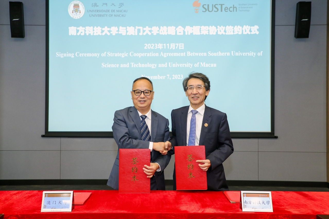 访问南方科技大学期间,宋永华与该校校长薛其坤签署《澳门大学—南方科技大学战略合作框架协议》,两校将加强各学科领域的学术及科研合作,开展本科生推优项目合作,鼓励教研人员联合申报科研项目、促进科技成果转化等。宋永华表示,南方科技大学一直是澳门大学重要的合作伙伴,两校很早便开始共同探索学术科研合作和人才联合培养,是次合作协议的签署意味着两校合作交流水平正式上升为战略合作关系,期待两校未来继续携手同行,共同推动粤港澳大湾区高等教育高质量发展。薛其坤亦表示,两校一直都有良好的合作基础,期望未来携手推动大湾区高等教育共同体建设,打造大湾区高等教育合作新范式。澳大代表团亦参观了南方科技大学校园发展与医学院建设。