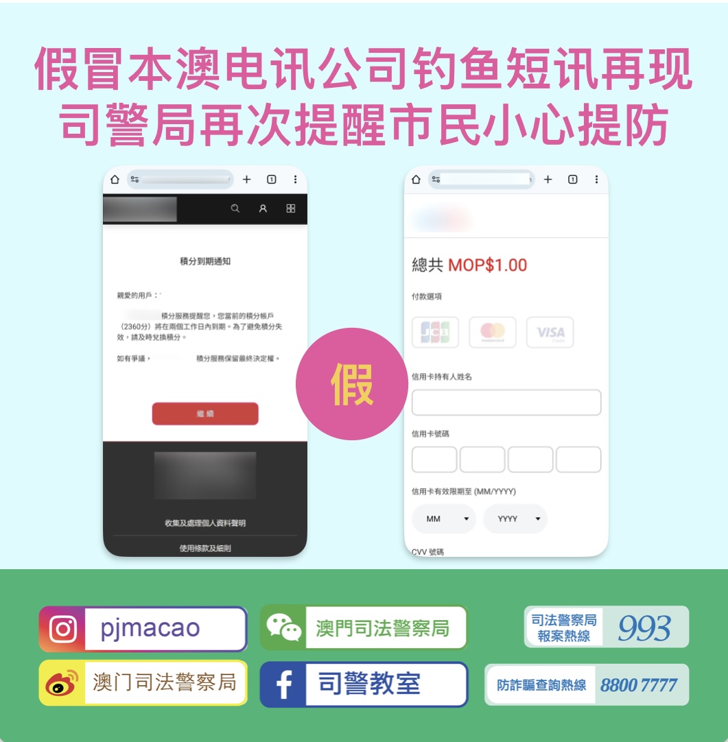 司警局反诈骗协调中心再次提醒市民,本澳近期常出现类似手法的诈骗案件,且有关假冒网站与官网十分相似,市民必须警惕,切勿点入不明网站连结或提供任何个人资料;若被要求提供信用卡资料、帐户交易密码、交易验证码,更要加倍谨慎,防止银行帐户或信用卡被盗用;怀疑遇到诈骗或其他犯罪时,应立即致电司警局防诈骗查询热线8800 7777或报案热线993求助。