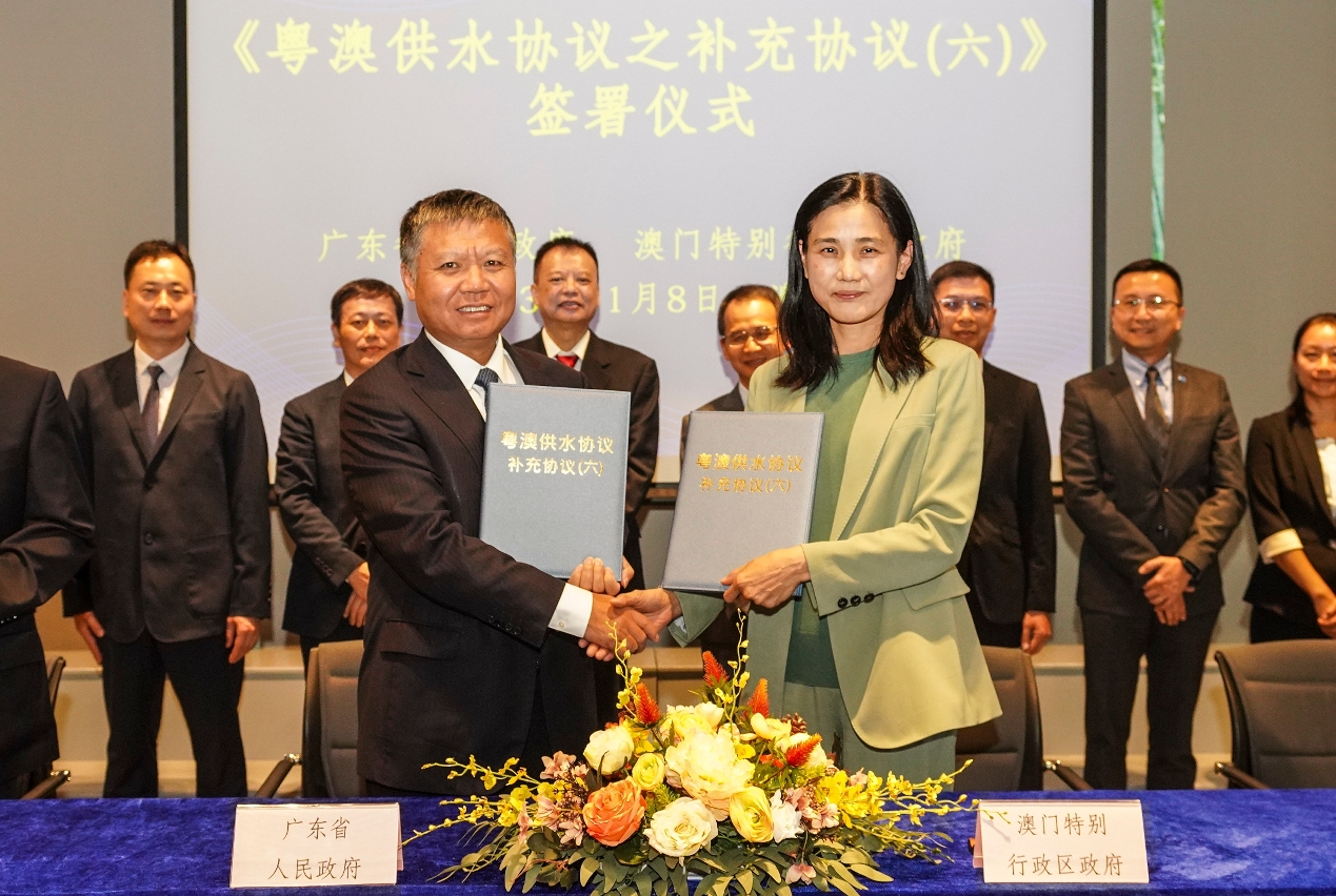 粤澳双方代表周三(8日)于澳门海事及水务局大楼签署《粤澳供水协议之补充协议(六)》,广东省人民政府代表广东省水利厅厅长王立新、澳门特别行政区政府代表海事及水务局局长黄穗文、珠海经济特区对澳门供水有限公司董事长李永海和澳门自来水股份有限公司执行董事关小冰出席仪式并签署补充协议。