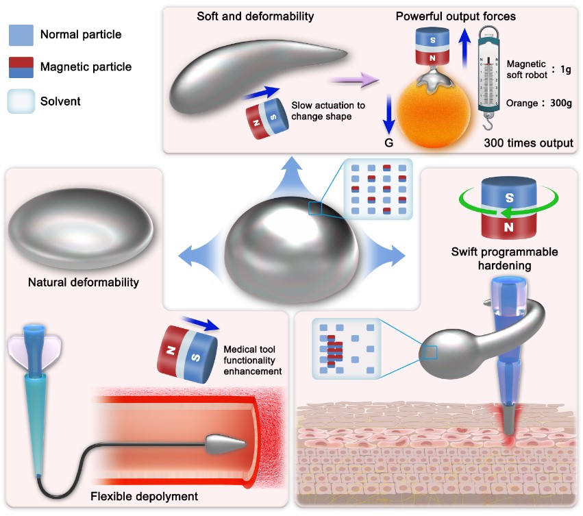 磁控机器人因其无线驱动和控制的特性,在医疗应用中体现出巨大优势。但在实际临床应用中,现有的磁控机器人存在功能少、输出力小、结构刚度小等局限性。因此,磁控机器人急需更加灵活、更强自适应性的部署策略和设计方法,才能充分发挥出其效能。徐青松研究团队开发的磁控机器人具有自身硬度快速可控切换的能力,可以灵活地黏附在各种物体表面,并提供强大的磁控输出力。该研究结果进一步实现磁控机器人取得更强大的操控功能。
