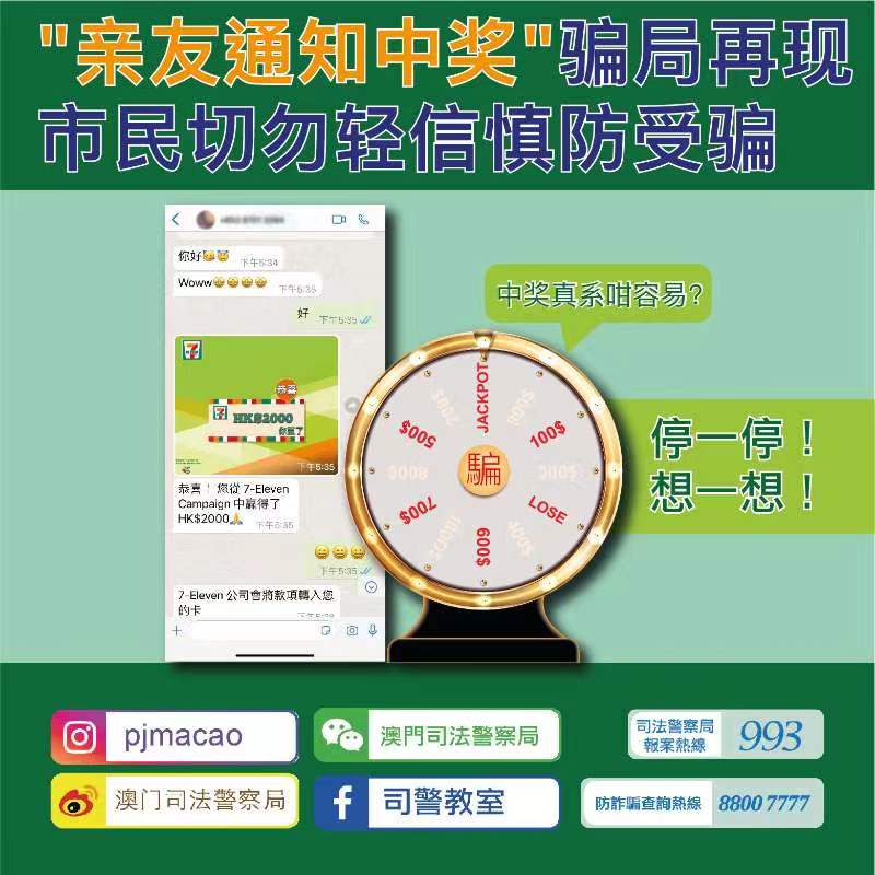 司法警察局今日接获市民检举,指收到“朋友”的Whatsapp讯息,称事主于7-11便利店举办的抽奖活动中获得2,000奖金,要求事主提供信用卡照片及一次性验证码,以便将奖金存入事主的信用卡内。由于对方的头像为其朋友,故事主相信并照办,其后事主手机收到多笔信用卡交易短讯方知被骗,遂向本局报案求助。