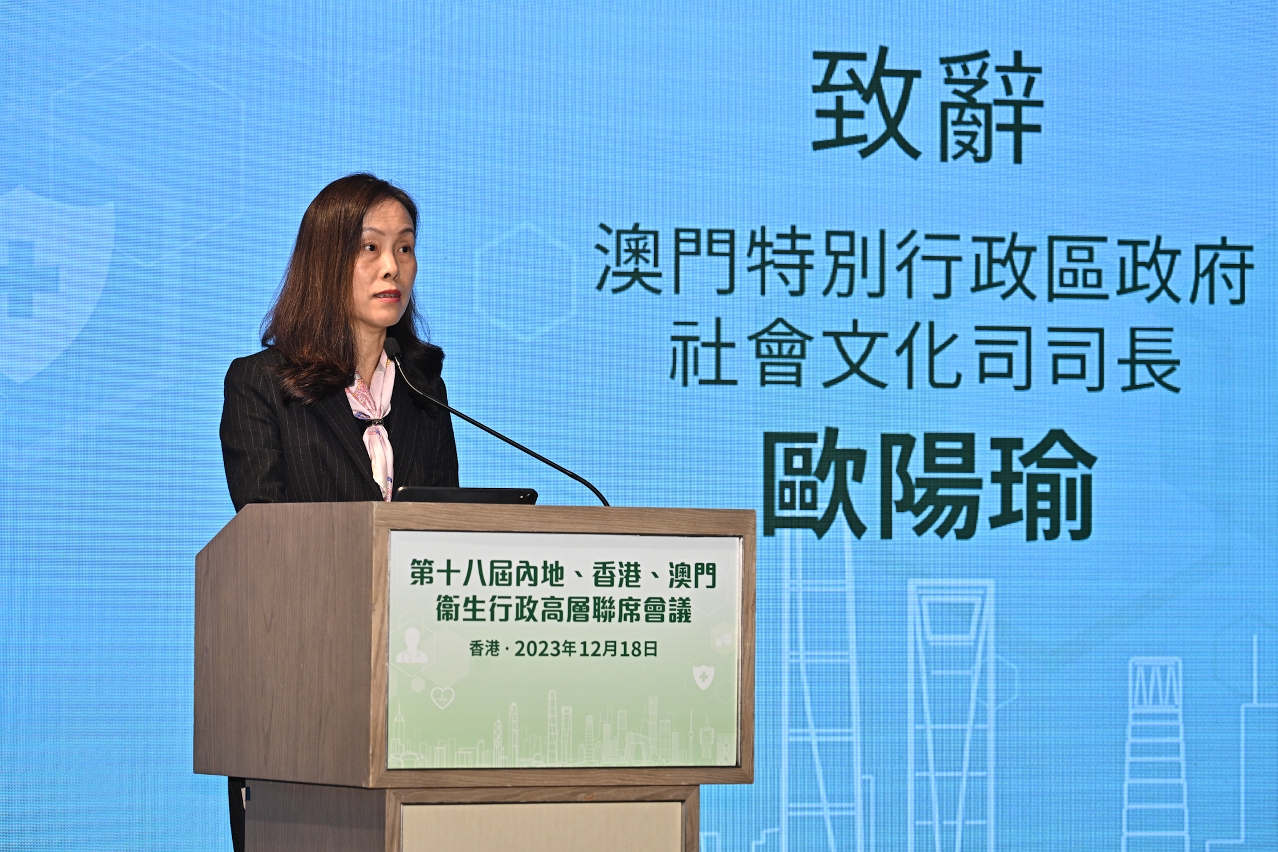欧阳瑜司长在开幕式上致辞表示,自2002年至今,内地、香港和澳门轮换举办卫生行政高层联席会议,汇聚三地相关范畴专家就重大、前沿的卫生议题进行讨论和交流,为三地成功应对各项包括新冠病毒、猴痘等重大公共卫生事件,制订有效的应对策略,累积了宝贵的防控经验,切实保障广大民众的生命安全,亦为促进全球公共卫生事业作出贡献。她续表示,受益于“一国两制”的成功实践,在国家长期的关心和支持下,澳门社会长期繁荣稳定,医疗、教育和社会保障等民生工作不断优化,服务水平稳步提高。今年10月,社会文化司与北京协和医院共同签署了《离岛医疗综合体北京协和医院澳门医学中心运营合作协议》,开创了澳门特区与内地合作办医的先例,也为澳门医疗服务的持续提升、大健康产业发展、医疗人才培养注入新动能。未来,澳门特区政府将继续贯彻国家“以人民健康为中心”的目标,以“预防优先,妥善医疗”的理念,不断优化医疗系统,继续围绕“健康政策、健康环境、健康行为”三个核心元素,推进各项有利建设“健康澳门”的措施,以更好对接国家《“健康中国2030”规划纲要》的战略部署。