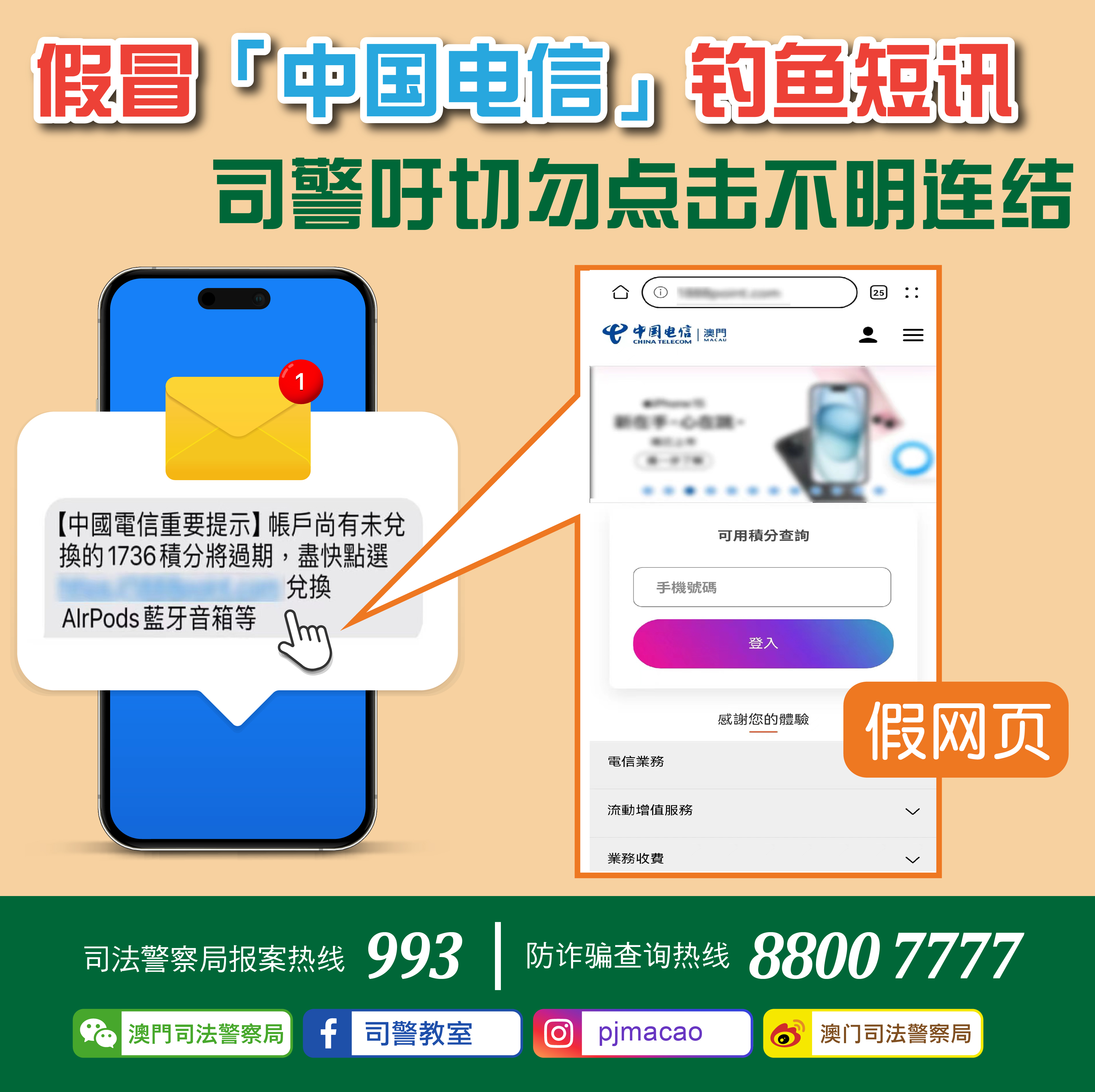 近日,司警局先后接获四名市民检举,报称收到以「中国电信」名义发出之短讯,内容以「积分即将到期」为由诱使事主点击短讯内附带之连结,继而进入一个假冒中国电信之网站并可以低价加积分兑换礼品,藉此套取了事主之个人资料及信用卡资料,最终导致事主之信用卡被人盗用。由于上述案件骗徒透过技术手段将发出之钓鱼短讯号码更改成与中国电信官方号码一致,从而使事主手机将涉案钓鱼短讯发送者识别为「中国电信」,以致事主误以为有关虚假讯息为官方发出,四名事主报称合共损失逾四万五千澳门元。