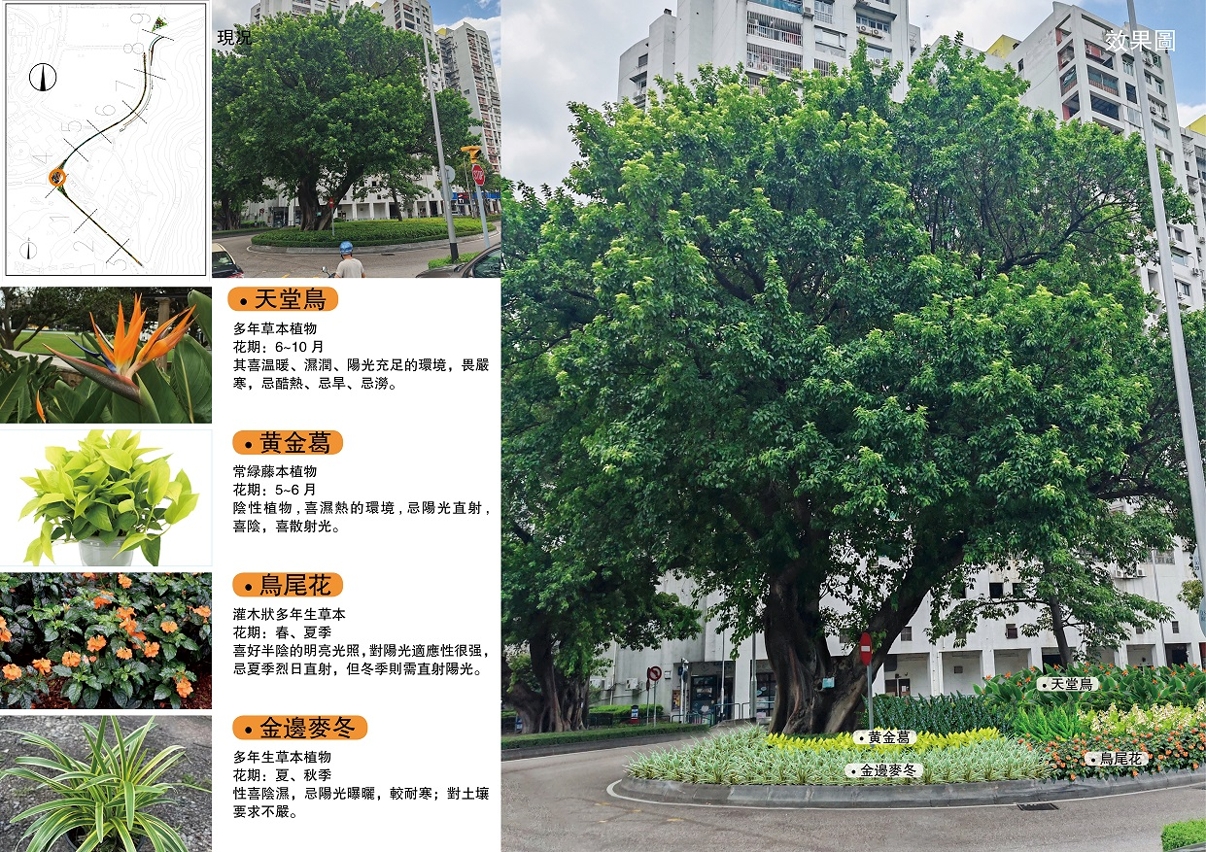 市政署持续有序展开绿化优化工作,改善各区绿化带植物衰退老化及病虫害频发等情况。当中由于高励雅马路绿化带植物出现衰退、泥土呈贫瘠和板结、灌溉系统老化等情况,严重影响该区植物的正常生长;故市政署展开绿化重整工作,并以“古树飞莺”为主题,透过花似鸟儿之“天堂鸟"作主题植物,盘旋在树木周邉,营造绿树之下,日昼莺语,打造清新的景观绿带。同时,配合现场环境,适度种植半阴和耐阴之观叶和观花植物,例如粉红佳人、猫眼竹芋、鸟尾花、龙船花和金叶拟美花等,植物层次分明带出整体设计布局,并将一并优化灌溉系统及部分老化围栏。