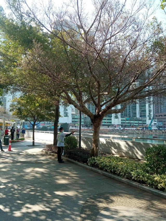 市政署持续巡查及护理各区街道树木,以维护树木健康及公众安全。近月树木管护人员在恒常巡查时发现,筷子基北湾、关闸马路、骑士马路一带的榕树出现季节性虫害,经鉴定为近年于邻埠肆虐的朱红毛斑蛾幼虫,故已采取防治措施,以抑制虫害扩散。