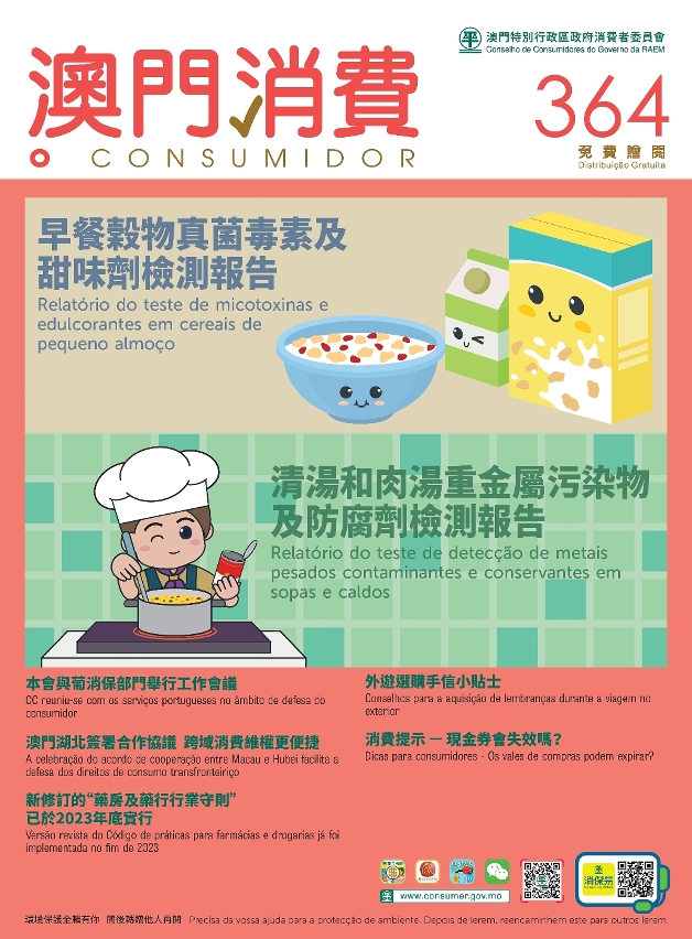 第364期《澳门消费》刊登20款早餐谷物,以及10款预包装清汤和肉汤的检测报告,全部样本受检项目符合本澳相关法规要求。