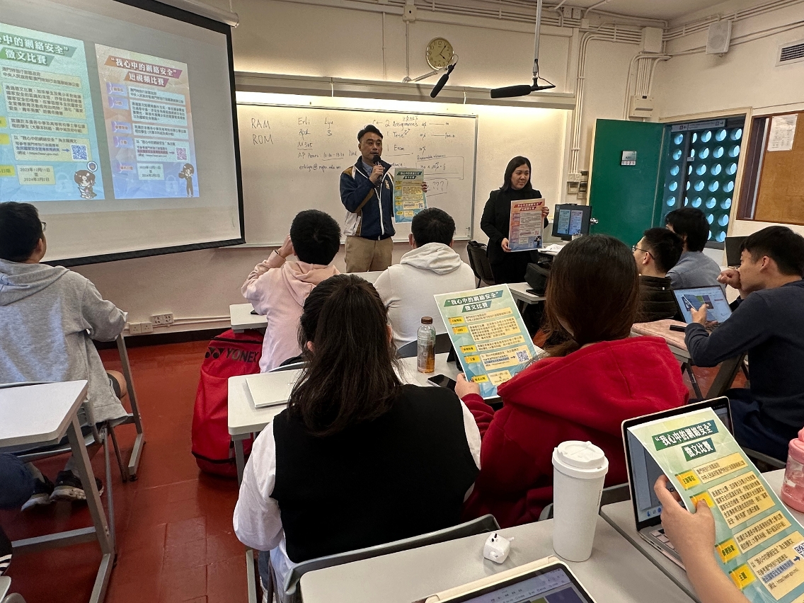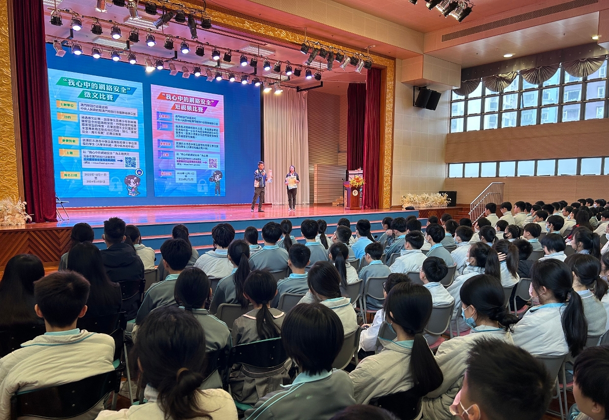 由澳门特别行政区政府、中央人民政府驻澳门特别行政区联络办公室联合举办的“我心中的网络安全”征文及短视频比赛现正接受报名,司法警察局自去年11月下旬开始持续派员走进校园开展相关宣传推广工作,鼓励学生踊跃参与。