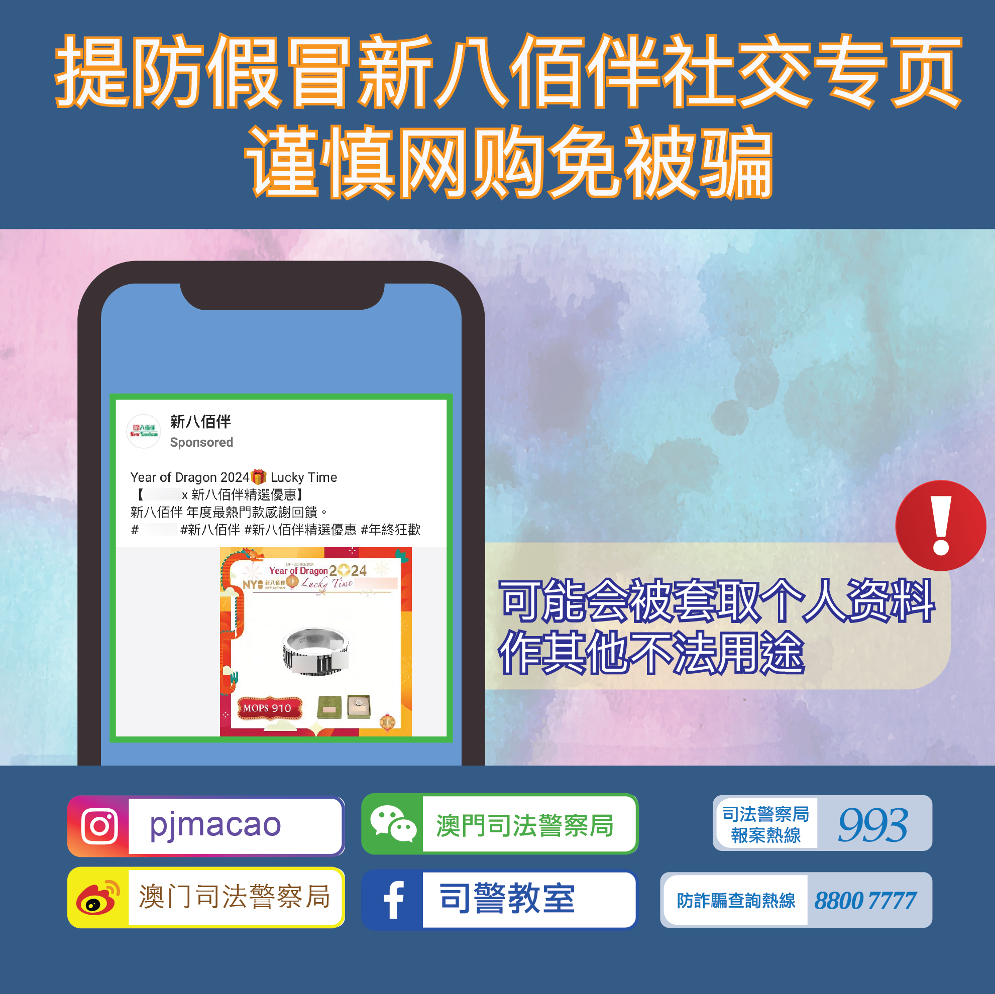 近日司警局发现一个假冒「新八佰伴」之Facebook专页,该假专页讹称「新八佰伴」正进行推广活动,以极优惠价钱出售名牌手袋、化妆品及饰物等。假专页并会以广告方式主动将有关帖文推送予Facebook用户,诱骗市民点击广告内假冒「新八佰伴」的连结下单。由于所出售的商品远低于市场价格,市民所购商品真伪存疑,更可能会被套取个人资料作其他不法用途。