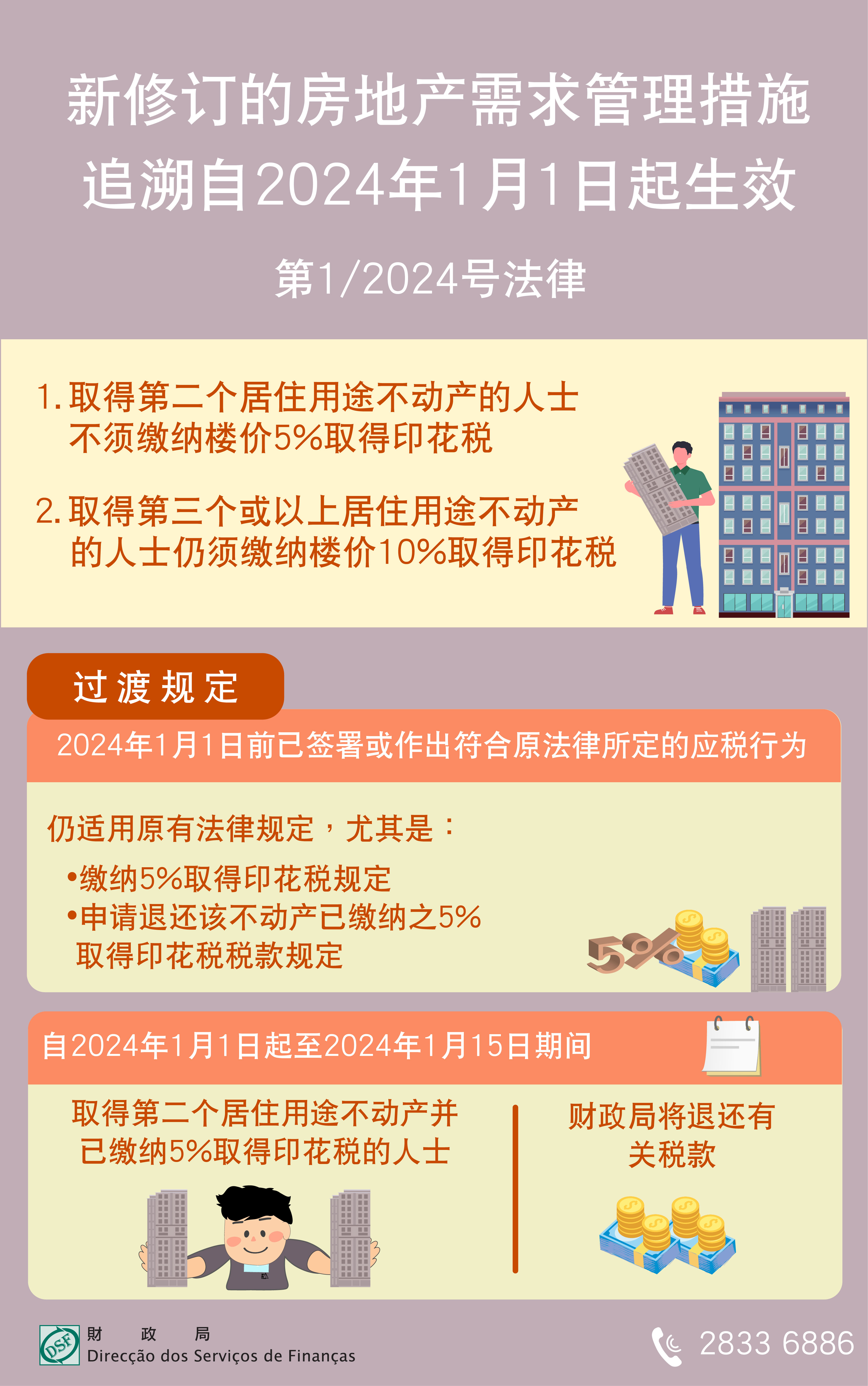 至于自2024年1月1日起至2024年1月15日期间取得第二个居住用途不动产并已缴纳百分之五取得印花税的人士,财政局将主动向该等人士退还有关税款。