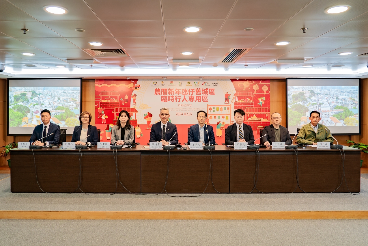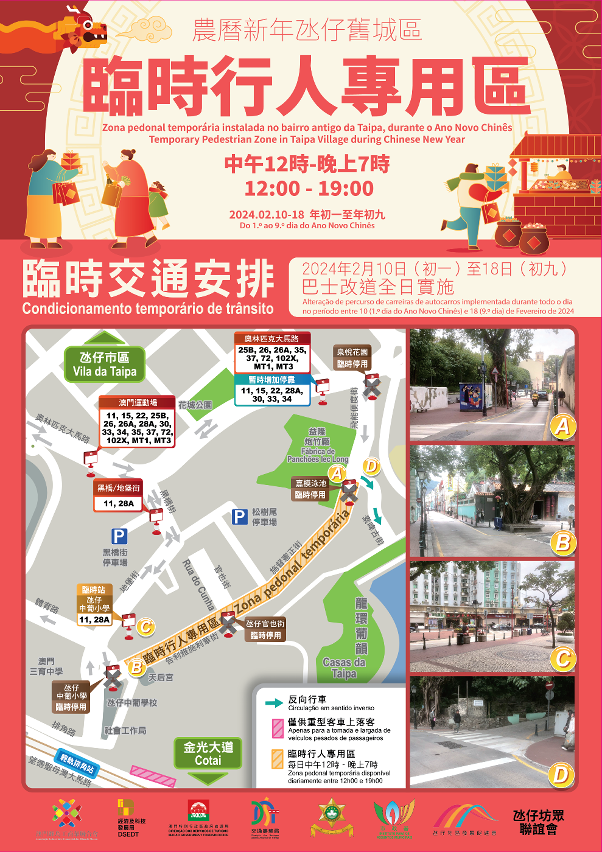 经研究及评估过去情况,于2月10日至18日(年初一至年初九)中午12时至晚上7时,在氹仔旧城区设置临时行人专用区。
