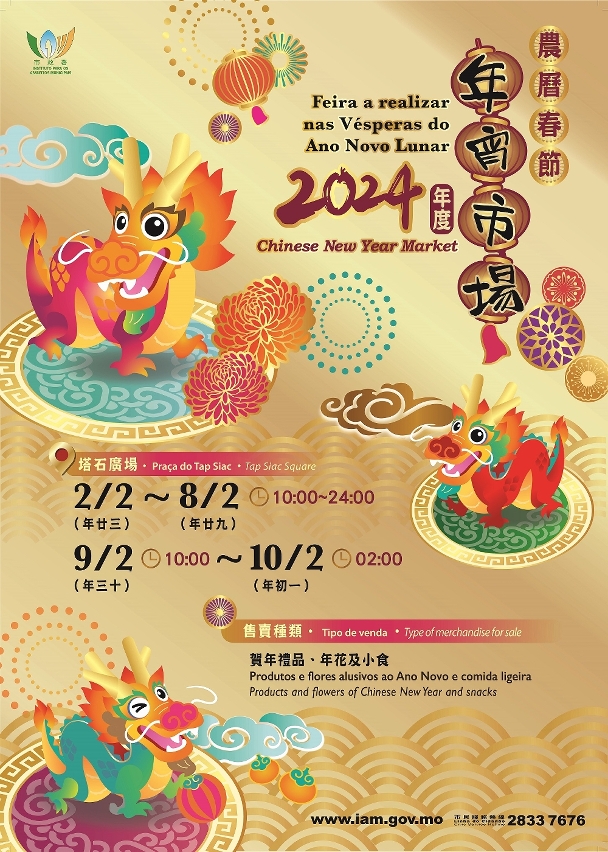 甲辰龙年将至,市政署今(2日)起一连八日于塔石广场举办年宵市场,现场除设有贺年礼品、年花及小食摊檔外,同时亦安排了文娱表演活动,设置大型花艺展览及贺年灯饰供观赏及拍照打卡,与市民及游客一起迎新岁、贺新禧。