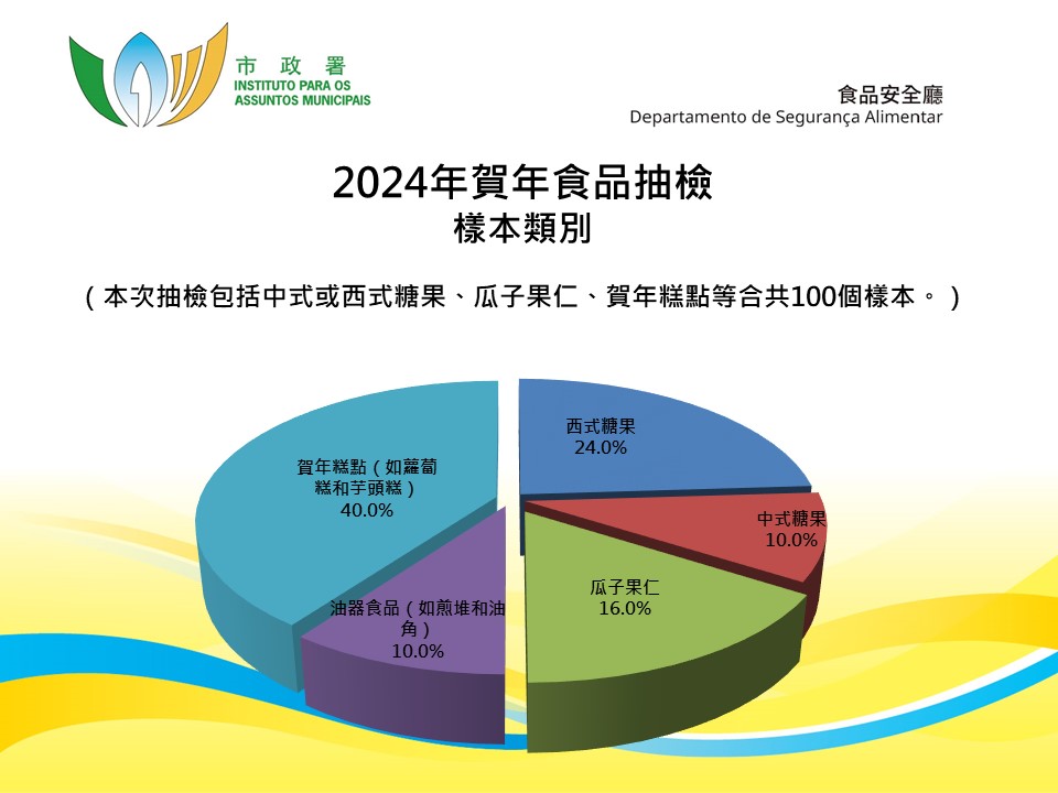 是次于本澳各零售点合共抽取了一百款贺年食品,包括中式或西式糖果、瓜子果仁、贺年糕点和油器食品,并进行微生物学或化学检验。微生物学检验包括沙门氏菌属、金黄色葡萄球菌和蠟样芽孢杆菌;化学检验则包括黄曲霉毒素B1、防腐剂及重金属等。结果有三款样本未能通过检测,其余九十七款样本未见异常。