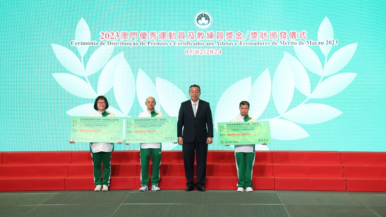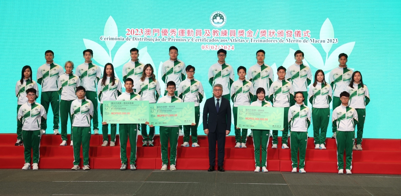 为表彰在2023年度参加体育比赛中获得优秀成绩的运动员及教练员,「2023澳门优秀运动员及教练员奖金/奖状颁发仪式」今(5)日晚上七时半举行,由澳门特别行政区政府社会文化司司长代表、社会文化司司长办公室主任何钰珊等出席了颁发仪式,并祝贺获奖的队伍。