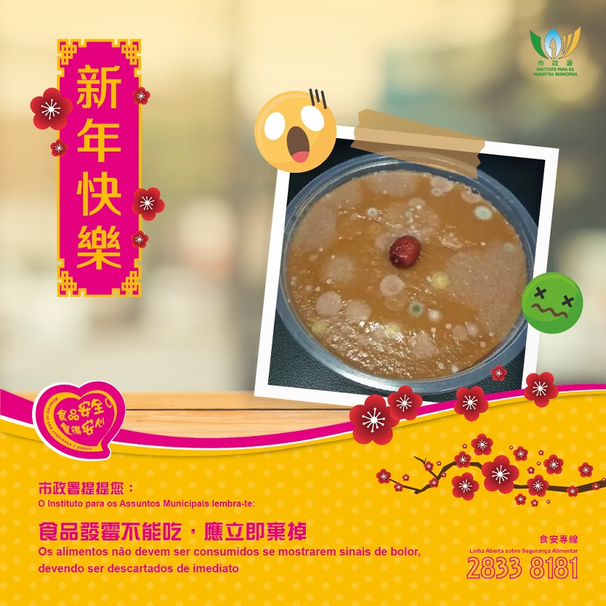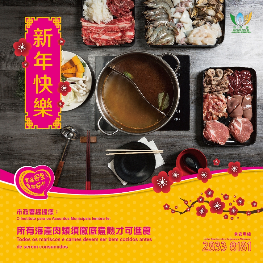市政署提醒市民,在节日期间要注意个人食品安全,尤其不应将糕点、剩余的餸菜在室温下置放过长时间;倘发现发霉或其他异常状况,应停止食用并弃掉。外出进食火锅或自助餐时,应以不同的餐具盛载或夹取生、熟食物,避免交叉污染;确保食物彻底煮熟后才可进食,亦应避免使用生鸡蛋作为火锅沾酱食用。在进食盆菜前,务必翻热至中心温度达摄氏七十五度或以上。只供观赏的贺年盆桔,其栽种条件、农药使用要求与食用蔬果存有一定差异,市民不应采摘作直接或加工腌制食用。此外,市民亦应注意均衡饮食,避免进食过量炸油角、煎堆、年糕、糖果等贺年食品。