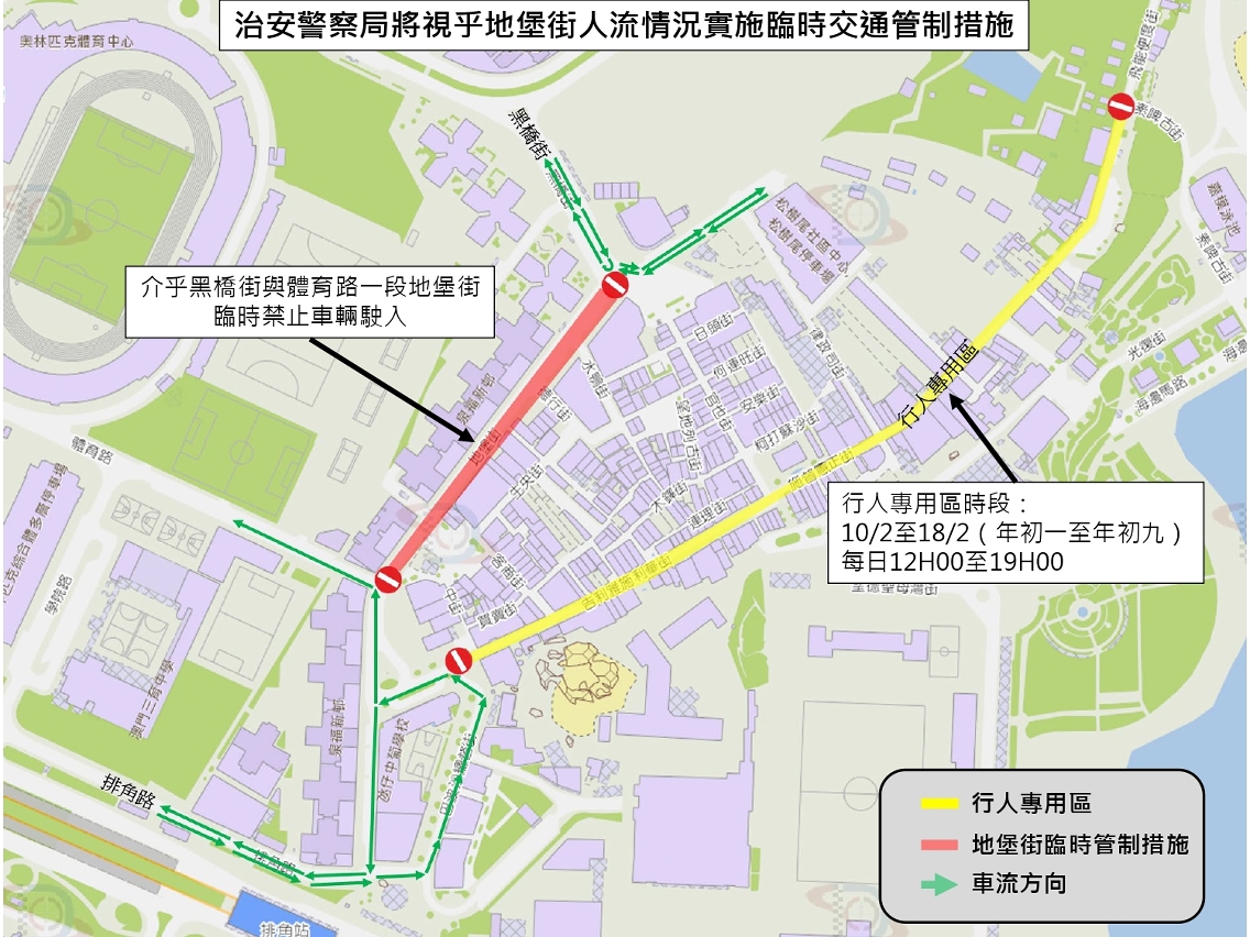 此外,倘地堡街人流挤拥,治安警察局将视乎实际情况,于介乎黑桥街与体育路一段地堡街实施临时封路措施,届时,将禁止车辆驶入有关路段(详见附图七)。