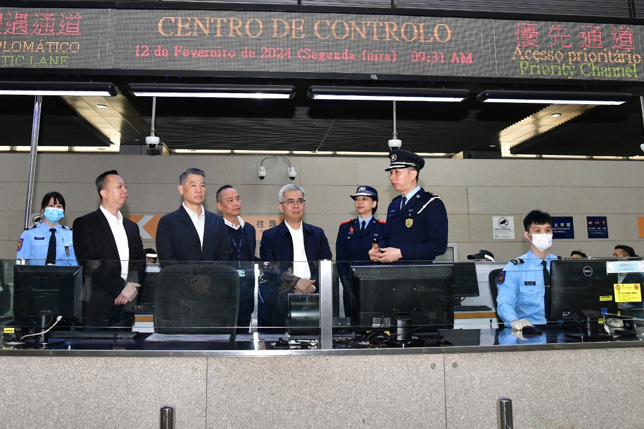 保安司司长先后到关闸、港珠澳大桥及横琴口岸澳门口岸区出入境事务站,以及海关查验区,视察各口岸通关、出入境车道运作、分流和便民措施的安排及关检运作情况,期间,保安司司长与内地边检及海关领导进行工作交流,并互致新春祝福。接着前往司法警察局报案及紧急行动中心,了解春节期间案件接收及侦查情况,黄司长指示所有人员需时刻保持警惕,加强防范及打击各类不法行为,严防不法分子于新春期间伺机犯案。
