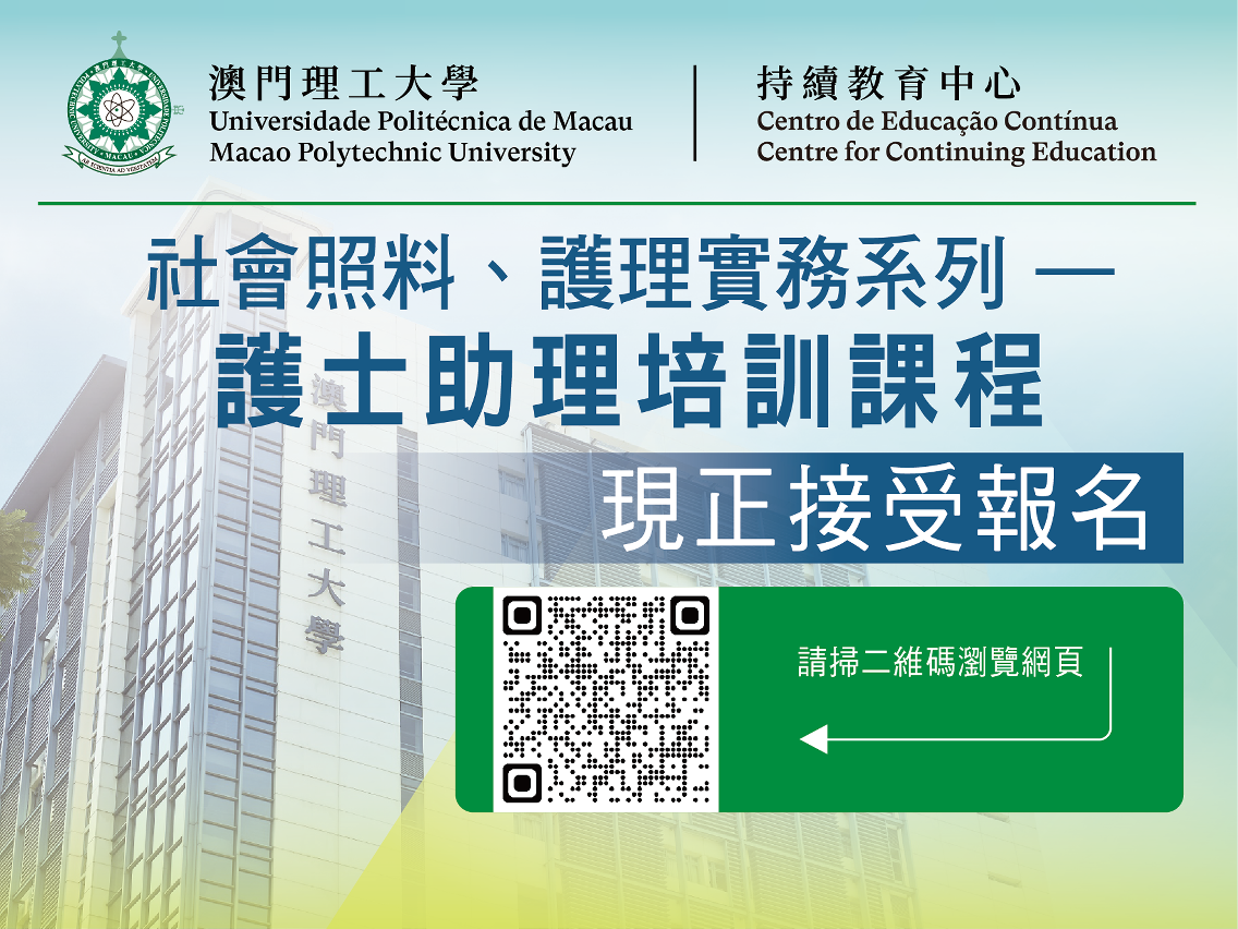 “第二届护士助理培训课程”符合资格的报名人将参加面试,择优录取入读课程。查询课程及报名,请致电澳门理工大学持续教育中心,电话:87950707 、87950832或87950750。