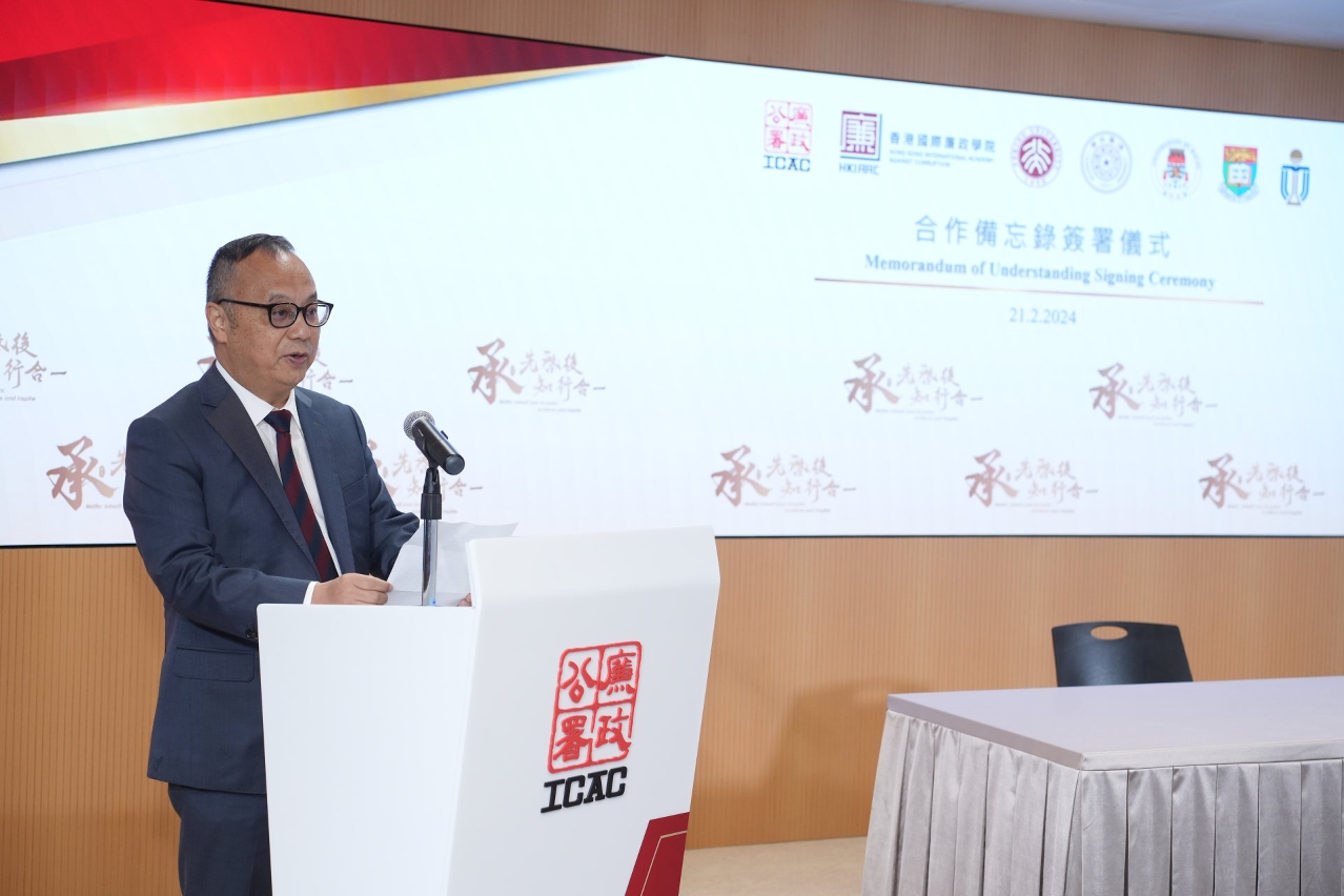 为推动反贪研究和人才交流,澳门大学法学院与香港国际廉政学院签署合作备忘录,澳大校长宋永华受邀出席见证并致辞。宋永华表示,澳大将为与香港国际廉政学院的合作竭尽所能,发挥澳大所长,助力国家所需。