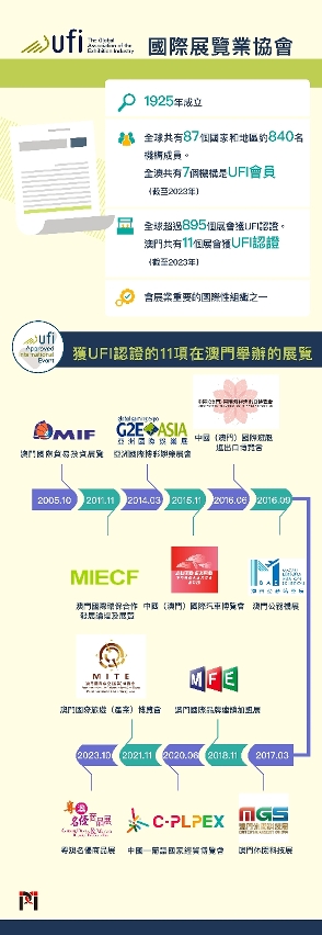 全球超过895个展会获UFI认证。由于UFI的认证是高品质展览会的标志,可发挥“品牌效应”以招揽更多国际客商参展参会,从而提升展会的国际影响力,因此,贸促局积极推动并携手业界着手认证工作。在2005年“澳门国际贸易投资展览会”成为澳门首个获UFI认证展览。截至2023年澳门共有11项展览获UFI认证,包括旅游、商贸、环保、汽车、游艇、航空等领域。