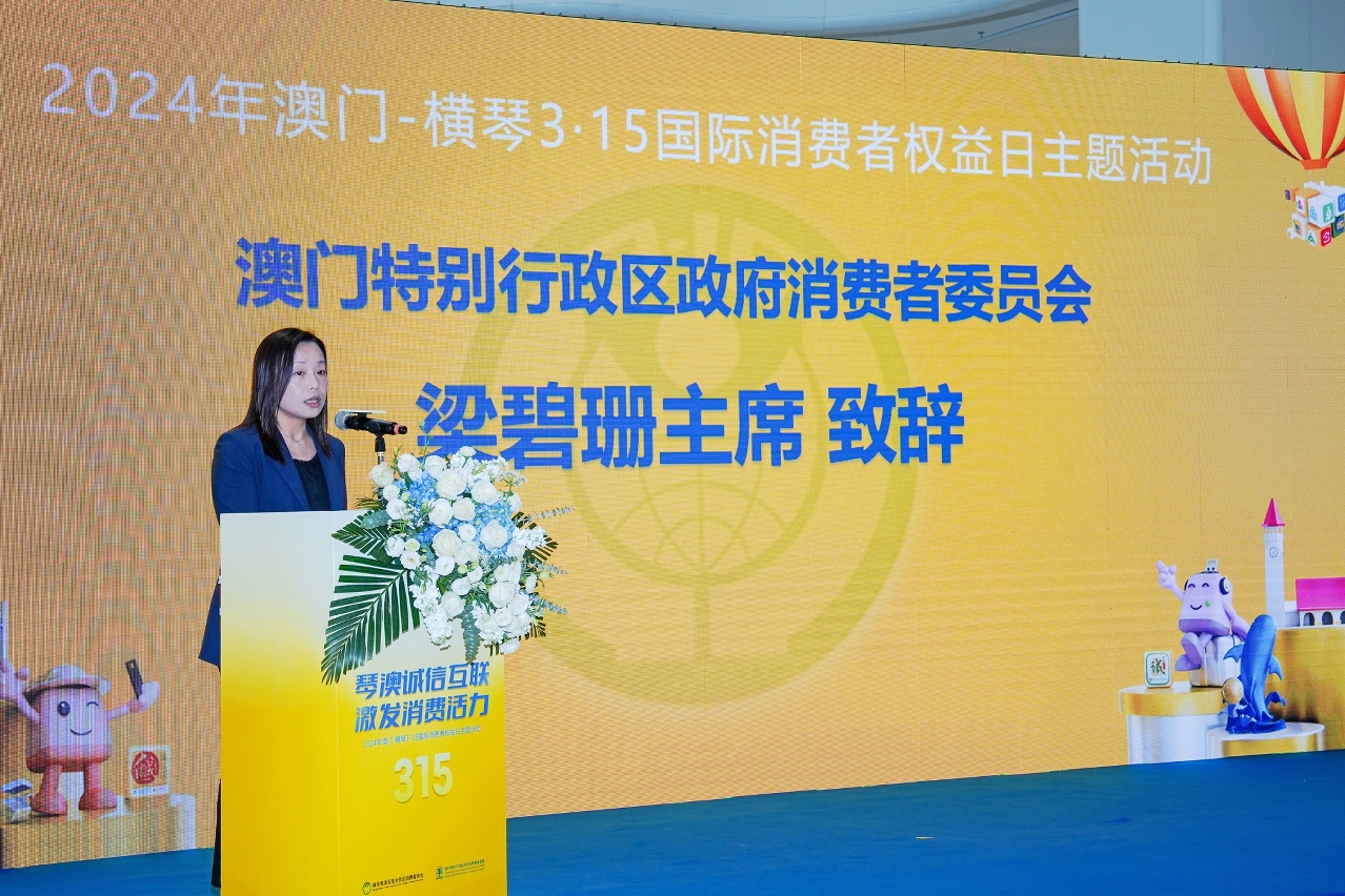澳门消委会主席梁碧珊致辞表示,今(2024)年是深合区实现第一阶段发展目标的关键之年, 澳门消委会一直配合澳门特区政府“1+4”适度多元发展策略,立足于澳琴一体化发展格局,整合优势资源,通过两地诚信店的联动,共同打造诚信片区,为消费者带来更优质的体验,共建安全、放心的消费环境。