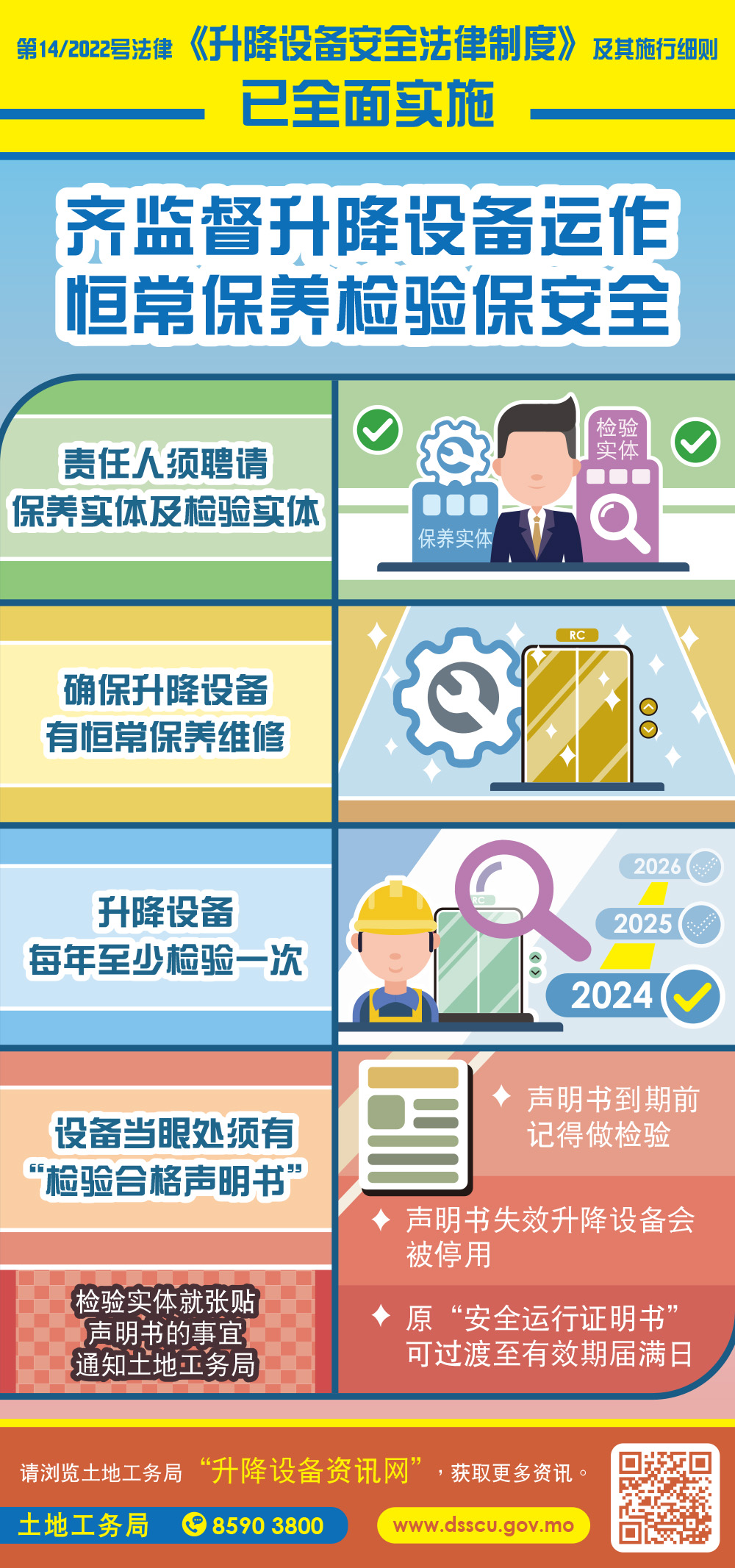 第14/2022号法律《升降设备安全法律制度》及相关配套法规于4月1日起正式生效实施,为确保设备使用安全,责任人须聘请保养实体和检验实体负责设备的保养及检验工作。升降设备每年须至少进行一次检验,并将检验合格声明书张贴设备当眼处。土地工务局呼吁使用者注意升降设备使用情况,如有问题应透过升降机内的联络资讯通知保养实体。
