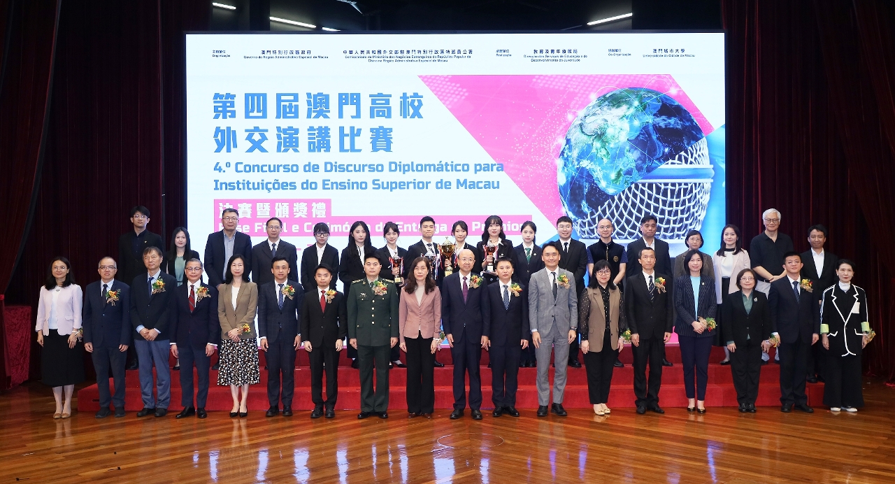 由澳门特别行政区政府、中华人民共和国外交部驻澳门特别行政区特派员公署主办,教育及青年发展局承办、澳门城市大学协办的第四届澳门高校外交演讲比赛决赛于4月26日在澳门城市大学举行。出席嘉宾包括外交部驻澳门特别行政区特派员公署特派员刘显法、社会文化司司长欧阳瑜、中央人民政府驻澳门特别行政区联络办公室教育与青年工作部副部长李勇先、中国人民解放军驻澳门部队政治工作部副主任刘陈长大校、教青局局长龚志明、副局长丁少雄、阮佩贤、黄嘉祺、以及各高等院校领导。