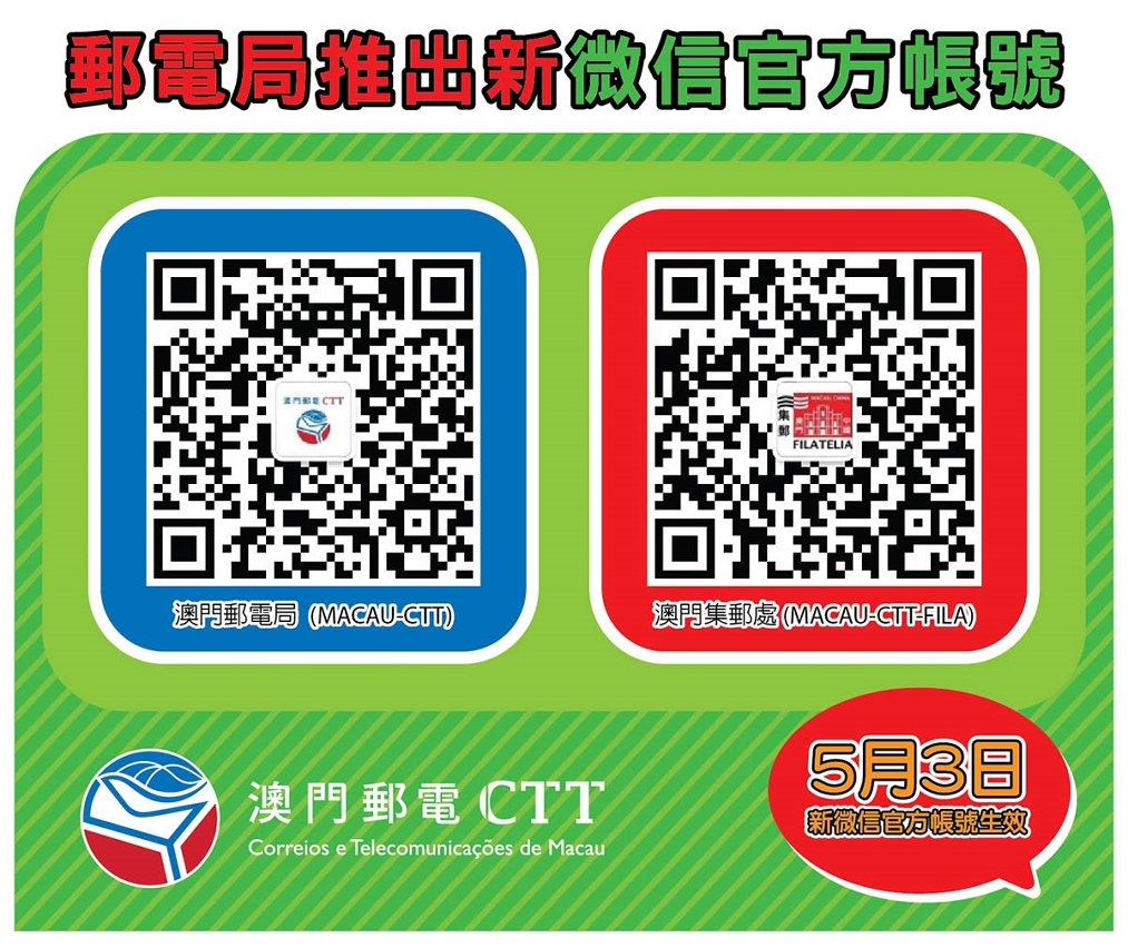 邮电局于5月3日推出两个新微信官方帐号 “澳门邮电局(MACAU-CTT)”及 “澳门集邮处(MACAU-CTT-FILA)”。同时旧版微信帐号 “澳门邮电” 及 “澳门集邮” 将于5月17日起停止提供服务。敬请市民扫描二维码并关注邮电局新微信官方帐号,以取得最新资讯。