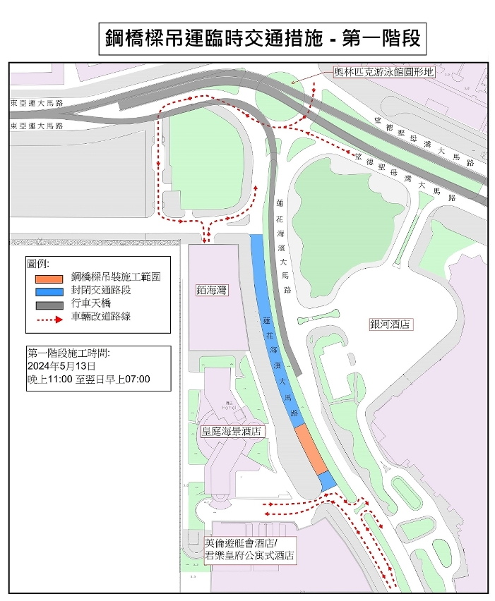 因应吊装行人天桥主体钢结构工程,5月13日晚上11时至翌日上午7时,皇庭海景酒店与奥林匹克游泳馆圆形地之间的一段莲花海滨大马路(往奥林匹克游泳馆圆形地方向)封闭交通。