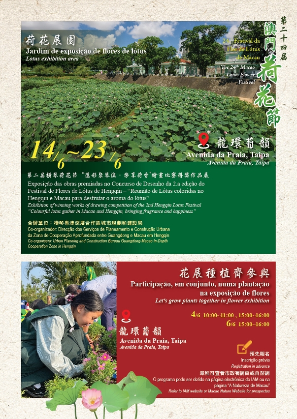 由市政署举办的“盛世莲花迎双庆─第二十四届澳门荷花节”将于六月十四日至二十三日在氹仔龙环葡韵举行,期间在本澳多处摆放盆荷供游人观赏,同时安排一系列展览和活动,内容丰富,动静皆宜,欢迎市民踊跃参与。