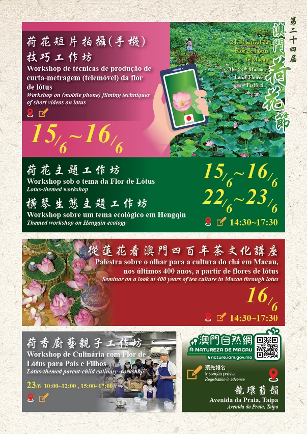 配合荷花节,市政署于不同地点将安排多项荷花为主题活动,包括与横琴粤澳深度合作区城市规划和建设局合办的第二届横琴荷花节“莲彩聚琴澳.乐享荷香”绘画比赛得奖作品展及“横琴生态主题工作坊”;另设“荷花短片拍摄(手机)技巧工作坊”、“横琴荷花生态游荷花主题工作坊”、“从莲花看澳门400年茶文化讲座”、“荷香厨艺亲子工作坊”、“赏荷生态游”、“横琴荷花生态游”、“花展种植齐参与”供市民参与。