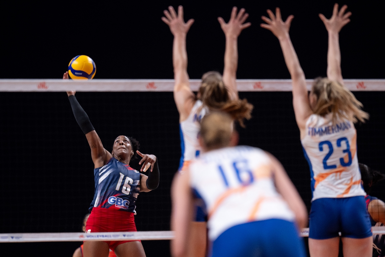 荷兰在第一局迅速进入作战状态,在主攻歌莉玛及丹碧琪接连得分之下以25比17先取一局;多明尼加共和国于第二局还以颜色,以25比23扳回一局;荷兰经调整后回复强势,以25比21再度领先,气势如虹的荷兰及后再胜25比17,局数3比1撃败多明尼加共和国。